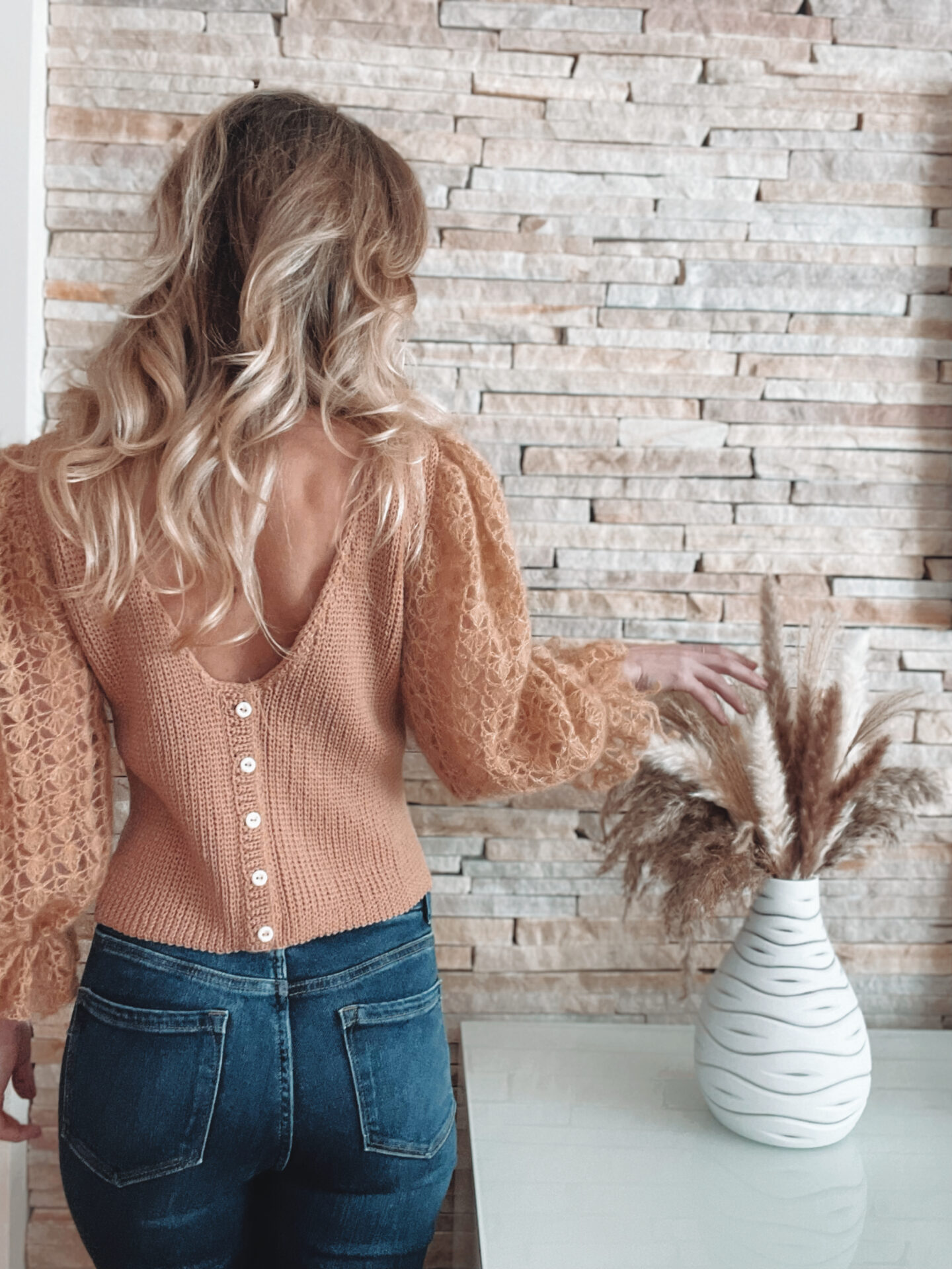 Ivy Top DK er en elegant og alsidig hæklet top, designet af Enida Avdic, som kombinerer to kontrasterende strukturer: strikkemasker og luftige blondemønstre. Toppen består af seks separate dele – forstykke, todelt bagstykke, to ærmer og en krave – der samles undervejs. For- og bagstykker hækles i den særlige “strikkemaske”-teknik, som opnås ved at bruge kædemasker i bagerste maskeled (KM BLO) og en variant med omslag (YO KM BLO). Ærmerne hækles separat i blondemønster med balloneffekt og samles med kroppen efterfølgende.
