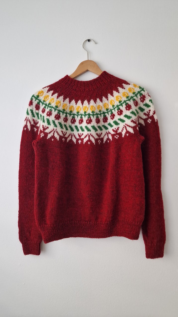 Finishing instructions include sewing the underarms, weaving in ends and blocking the sweater gently in lukewarm water for the best drape and stitch definition. Jólapeysa is ideal for knitters who enjoy traditional Icelandic sweaters and are comfortable working stranded colourwork in the round. With its rich red body, bright yoke and classic fit, this Lopamunstur design is a beautiful wardrobe staple as well as a perfect handmade Christmas sweater project.