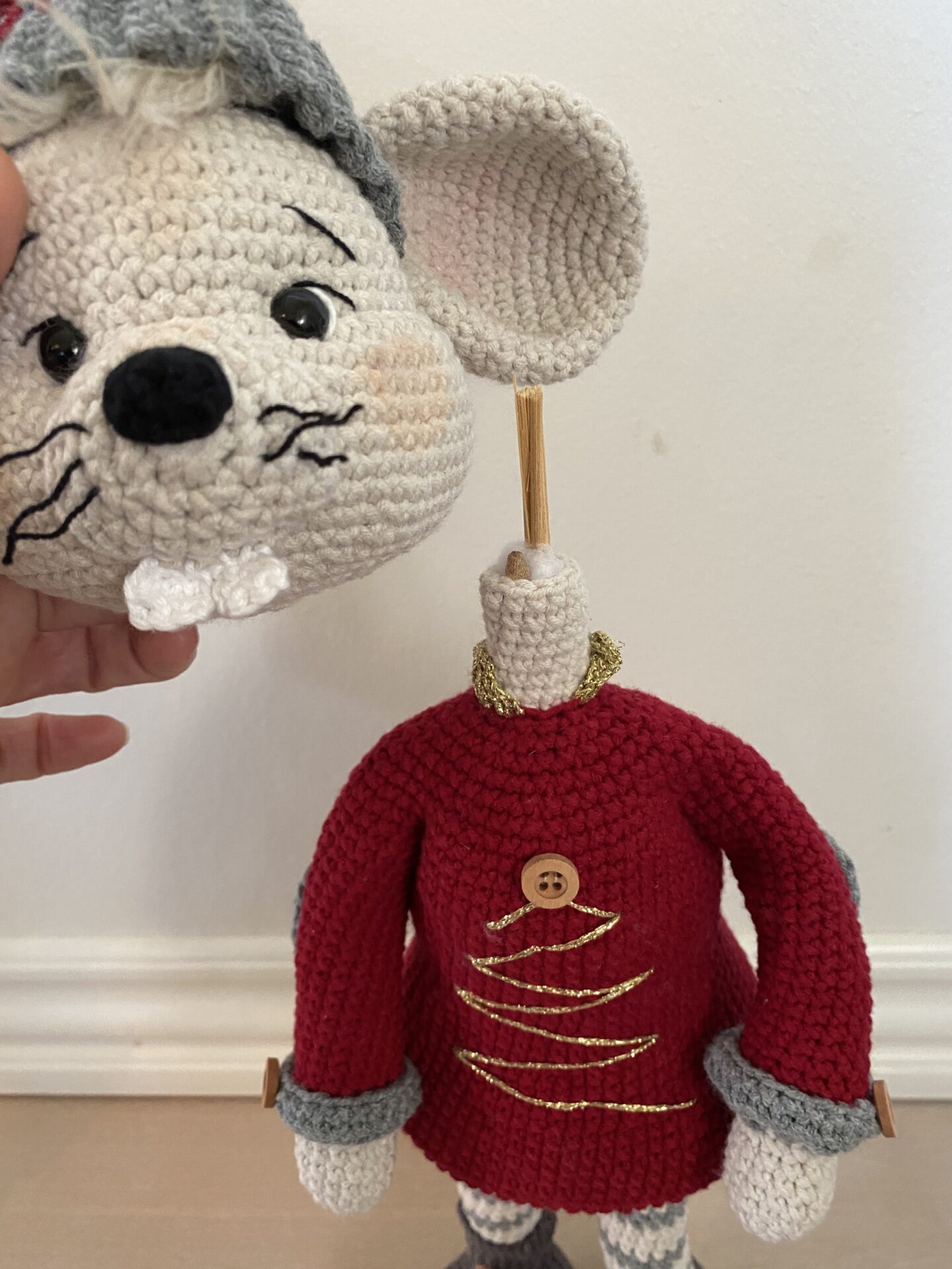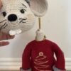 Projektet kræver flere hæklenåle i størrelserne 2,0 mm, 2,5 mm, 3,0 mm og 3,5 mm, afhængig af hvilke dele du arbejder på. For at give musen form og stabilitet anvendes både fiberfyld, plastgranulat til fødderne, bonsaitråd i armene samt pinde til benene. Resultatet er en figur, der kan stå oprejst og holde faconen – perfekt til udstilling.