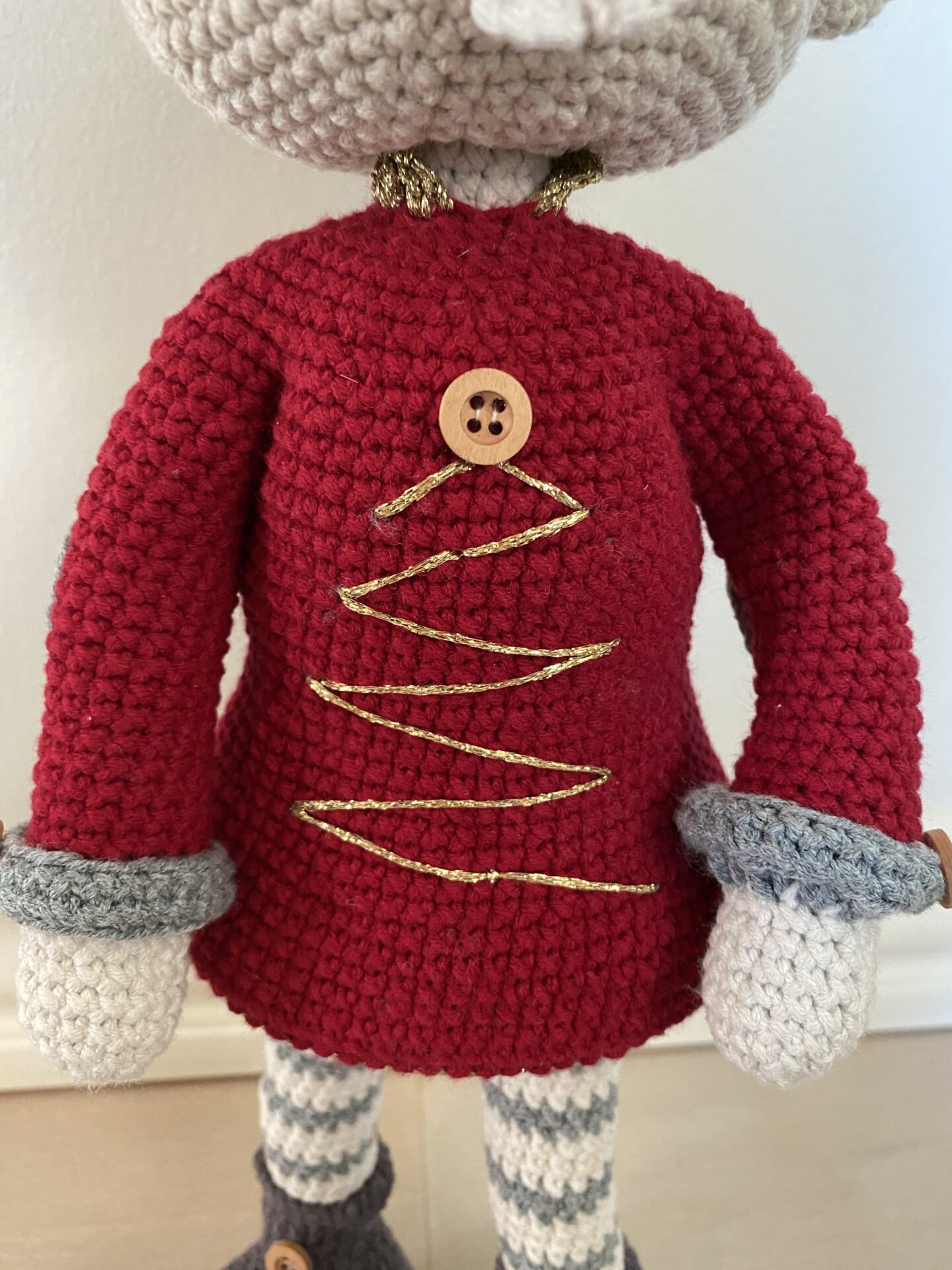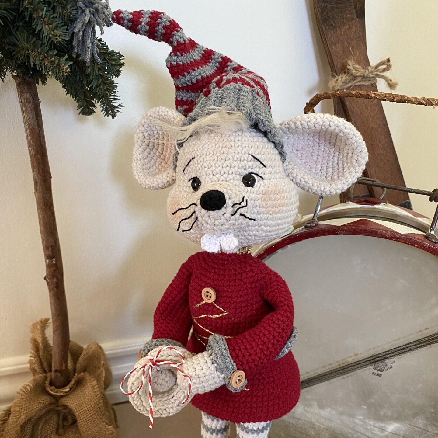 Den charmerende Julemus (han) fra Trines Makværk er det perfekte hækleprojekt til juletiden for den kreative sjæl, der elsker hjemmelavet julepynt. Den færdige mus måler ca. 45 cm i højden – og hele 50 cm, når den ikoniske nissehue er på – og er fyldt med fine detaljer, som gør den både unik og dekorativ. Fra de stribede ben og albuelapper til de små tænder, den broderede juletrøje og en lille vaniljekrans, er der kælet for hver eneste detalje. Julemusen er ideel som dekoration på en hylde, under juletræet eller som en sød gave.