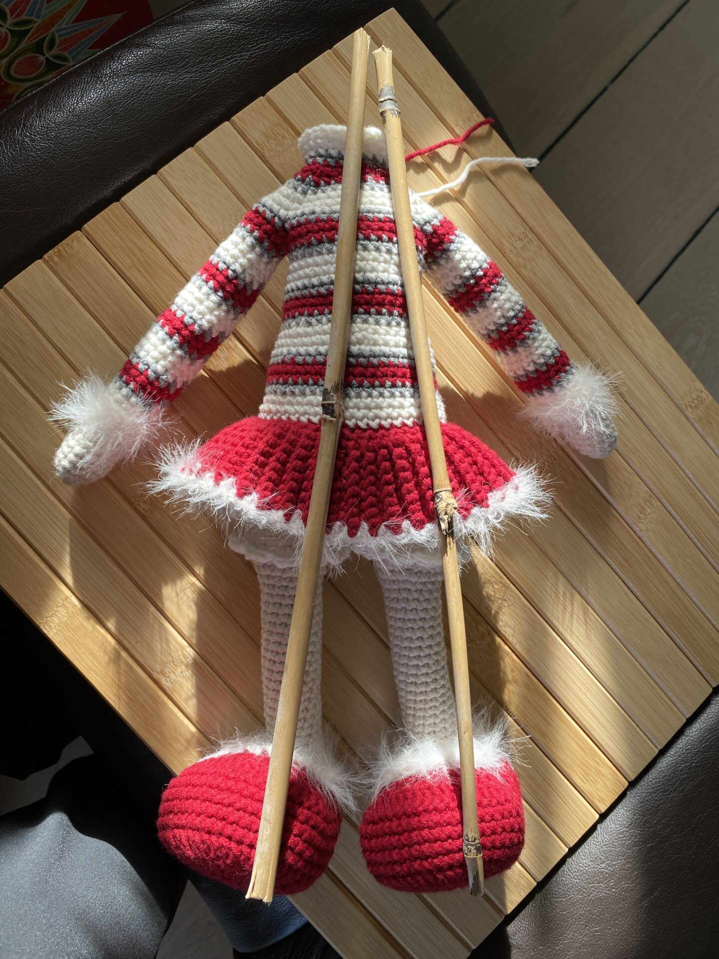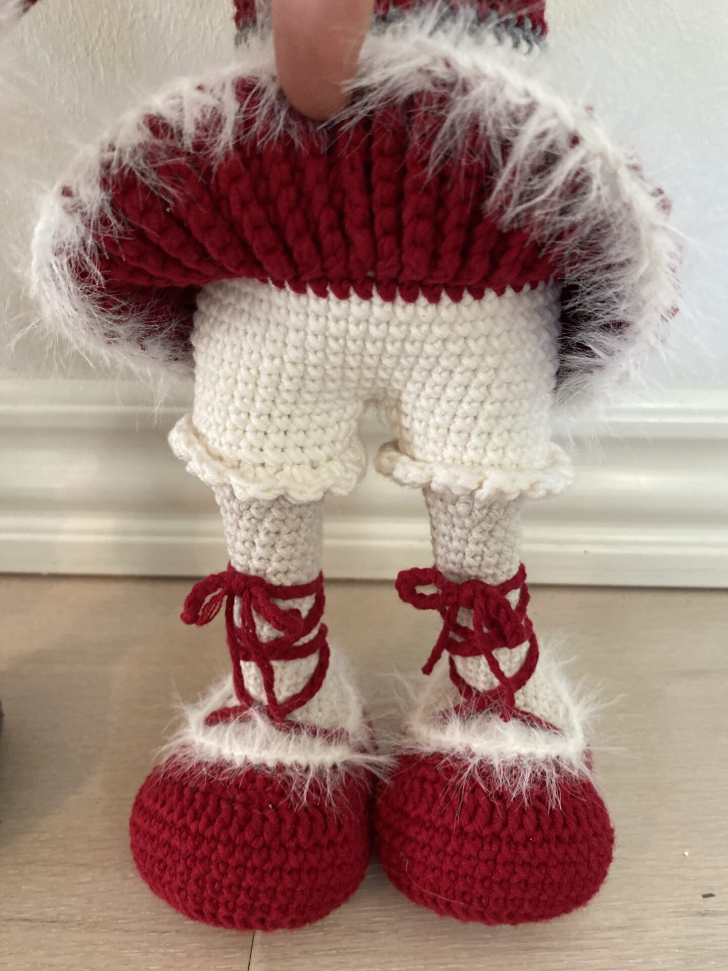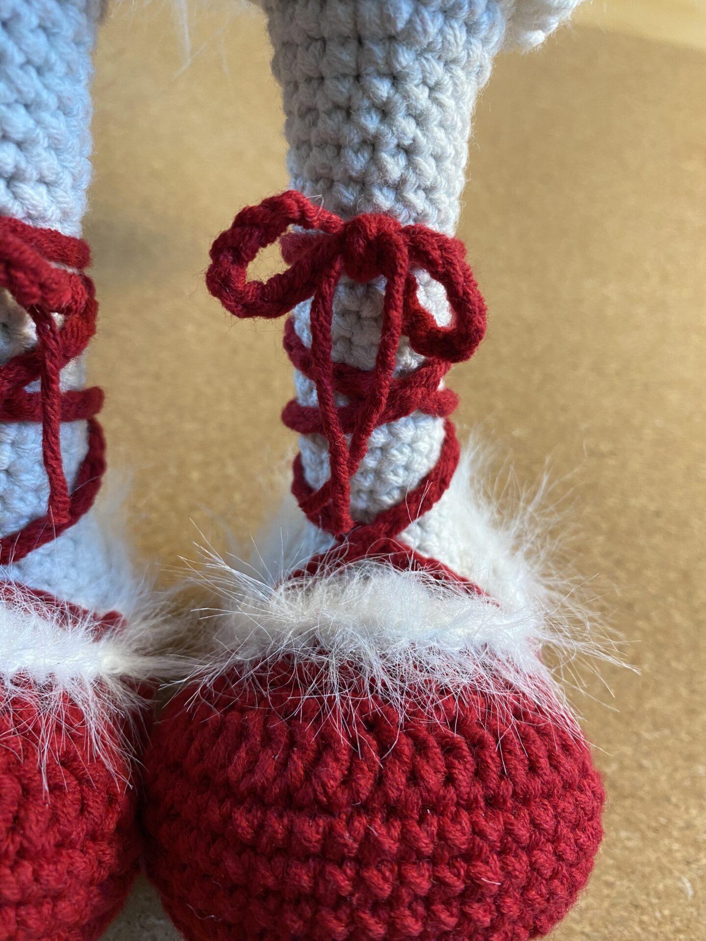 Opskriften er gennemarbejdet og nem at følge, og du guides trin for trin gennem hele processen – fra hæklede lemmer til tøj, hue og fine små pynteelementer. Julemusen hækles hovedsageligt i det bløde og lækre Cosy garn fra Go Handmade, hvor følgende farver anvendes: Off-White til krop, hoved og arme, Winter Red til sko, skørt, hue og detaljer, samt White, Grey og Dark Grey til striber og albuelapper. Derudover tilføjes Scheepjes Panda garn til pelskanter, og Rainbow Cotton 8/4 og 8/8 anvendes til mindre detaljer som snude, tænder, knurhår og øjenbryn.