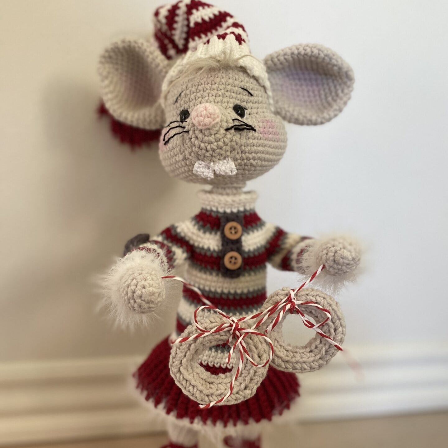 Den medfølgende opskrift indeholder desuden syvejledning til musens beklædning, herunder et yndigt skørt med blondeeffekt, en stribet sweater med albuelapper og stolpelukning, samt en nissehue med kvast, der kan krølles, som du ønsker. Du afslutter projektet med at montere fine detaljer såsom sikkerhedsøjne, tænder, snude og hårtot, hvilket giver musen sit karakteristiske, livlige udtryk.