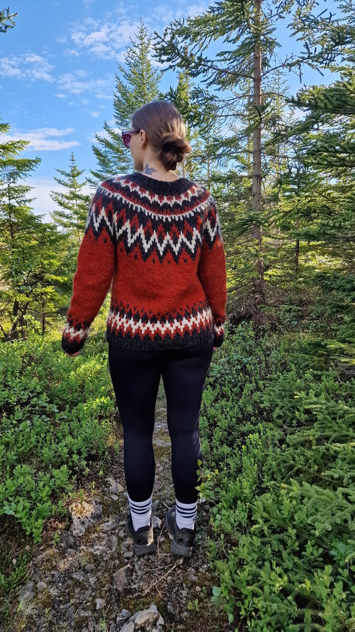 The Keilir Lopapeysa is a stunning Icelandic sweater designed by Rakel – Lopamunstur.is. This pattern captures the essence of traditional Icelandic knitwear with modern details, offering a slim fit and slightly shorter body length. The sweater is knitted seamlessly from the bottom up, with both body and sleeves worked in the round before being joined together for the striking colorwork yoke.