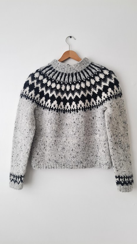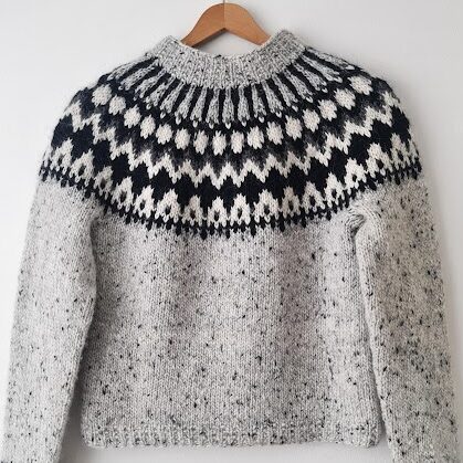 Krít is worked in the authentic Icelandic yarn Ístex Álafosslopi, a bulky and warm yarn spun from Icelandic sheep. This yarn comes in 100 g skeins with 100 m per skein, which gives a yardage of 50 m per 50 g. The pattern uses four shades: Light Grey Tweed 9974 as the main color, with contrasts in Black 0059, Dark Grey 0058, and White 0051. Depending on the size, the sweater requires between 9 and 13 skeins of Álafosslopi in total.
