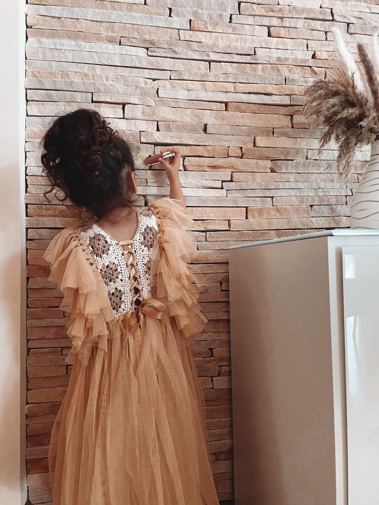 Laila Princess Dress er en eventyrlig hæklet kjole til børn i alderen 0 måneder til 10 år, skabt af Enida Avdic. Den kombinerer håndlavede bedstemorfirkanter med tyl og bløde naturmaterialer som bambusgarn for at skabe et unikt og komfortabelt design. Kjolen består af en hæklet overdel og en fyldig tylskørt, der hæftes på med løkker for et luftigt, dansende udtryk. Overdelen er konstrueret af marguerit-bedstemorfirkanter, som hækles sammen til en U-form og tilpasses med ekstra rækker og bindebånd bagpå for perfekt pasform.