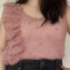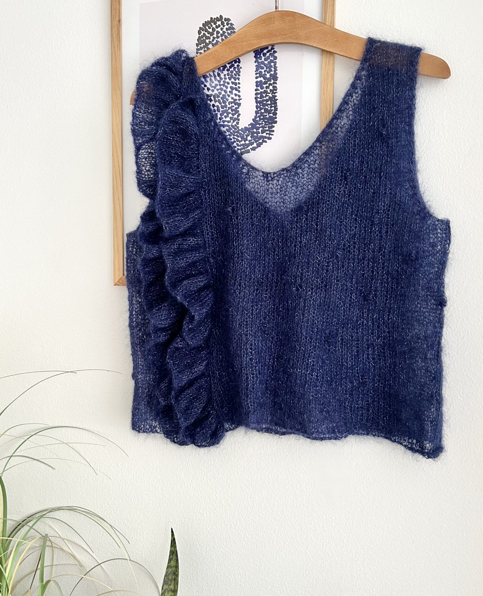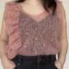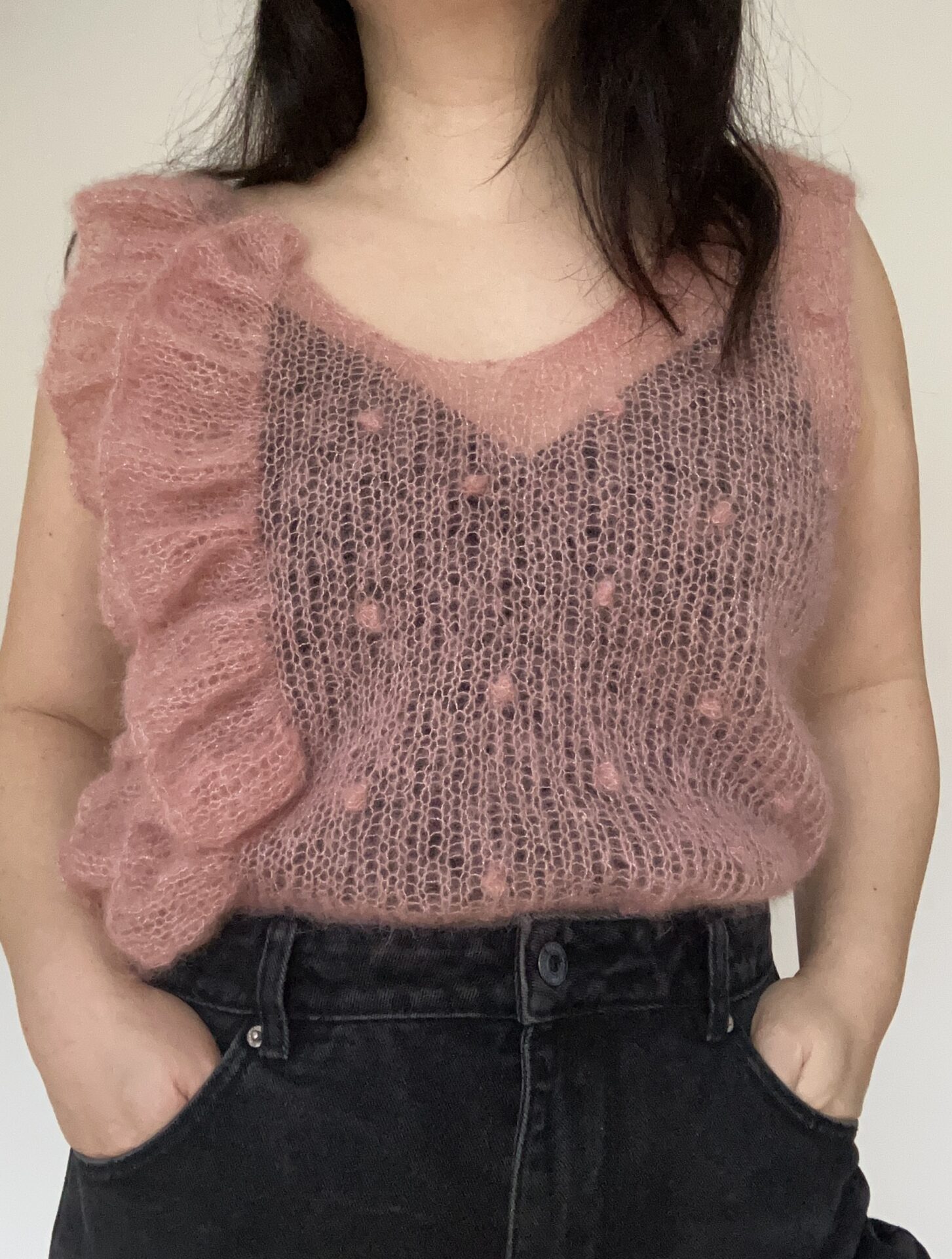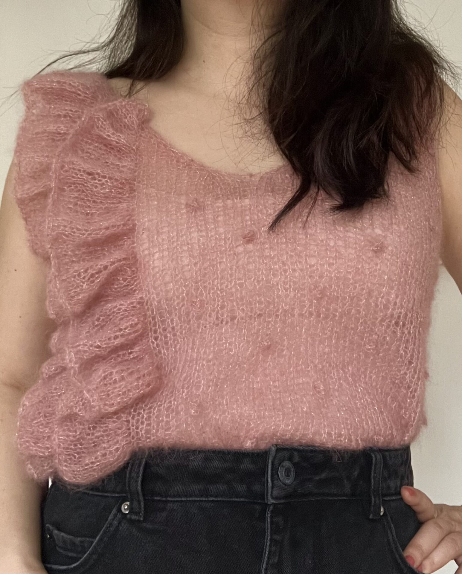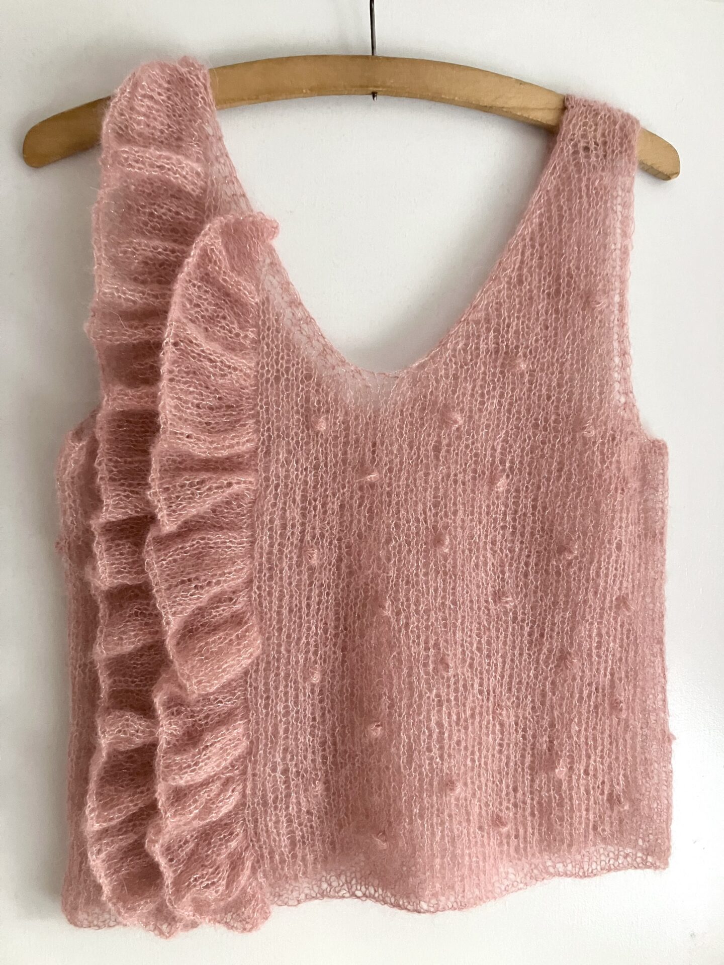 Last Minute Party Top af The Knit is On er den fineste top med flæser langs den ene side. Toppen strikkes i mohair med glimmer, der gør den ekstra festlig. Køb garnpakke til opskriften.