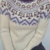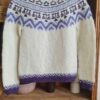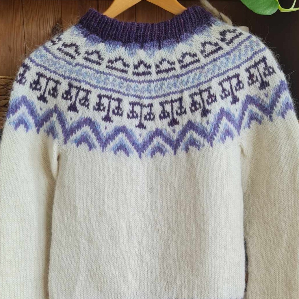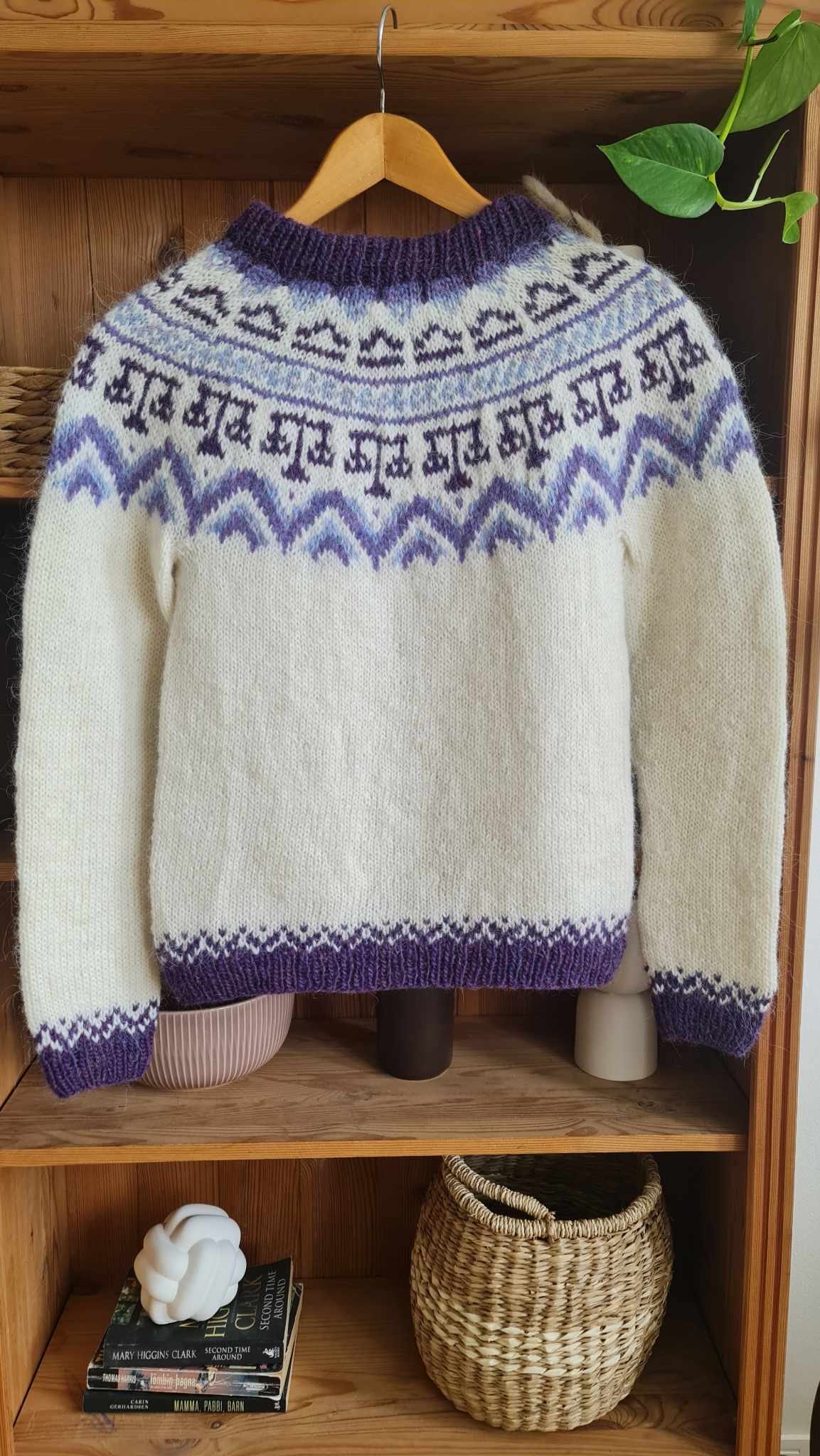 The design is worked using the classic Icelandic yarn Ístex Léttlopi, a light and warm yarn spun from 100% Icelandic wool. Each skein weighs 50 g and has a yardage of 100 meters, giving a running length of 100 m per 50 g. For some color sections, the pattern also suggests Ístex Plötulopi, which comes in 100 g unspun plates, but you can easily substitute with Léttlopi for all colors if preferred. The sweater uses a base color in white along with purple tones in light and dark shades, creating a beautiful contrast in the yoke motif.