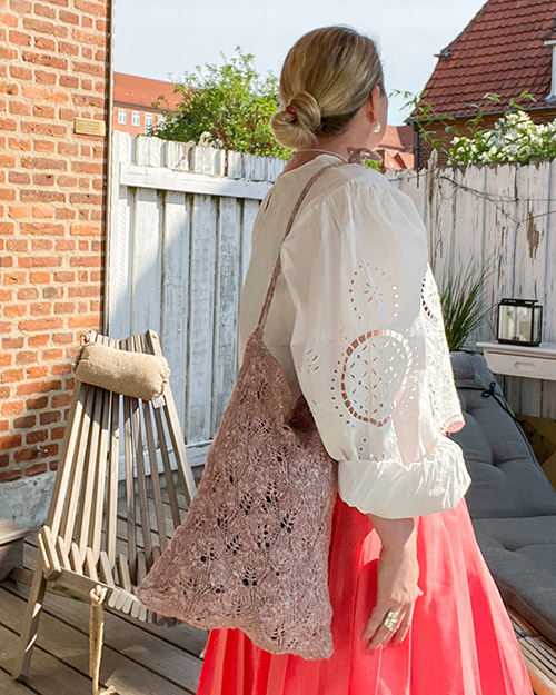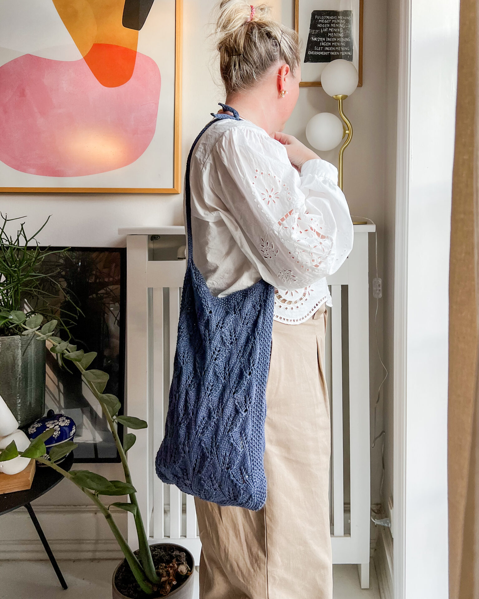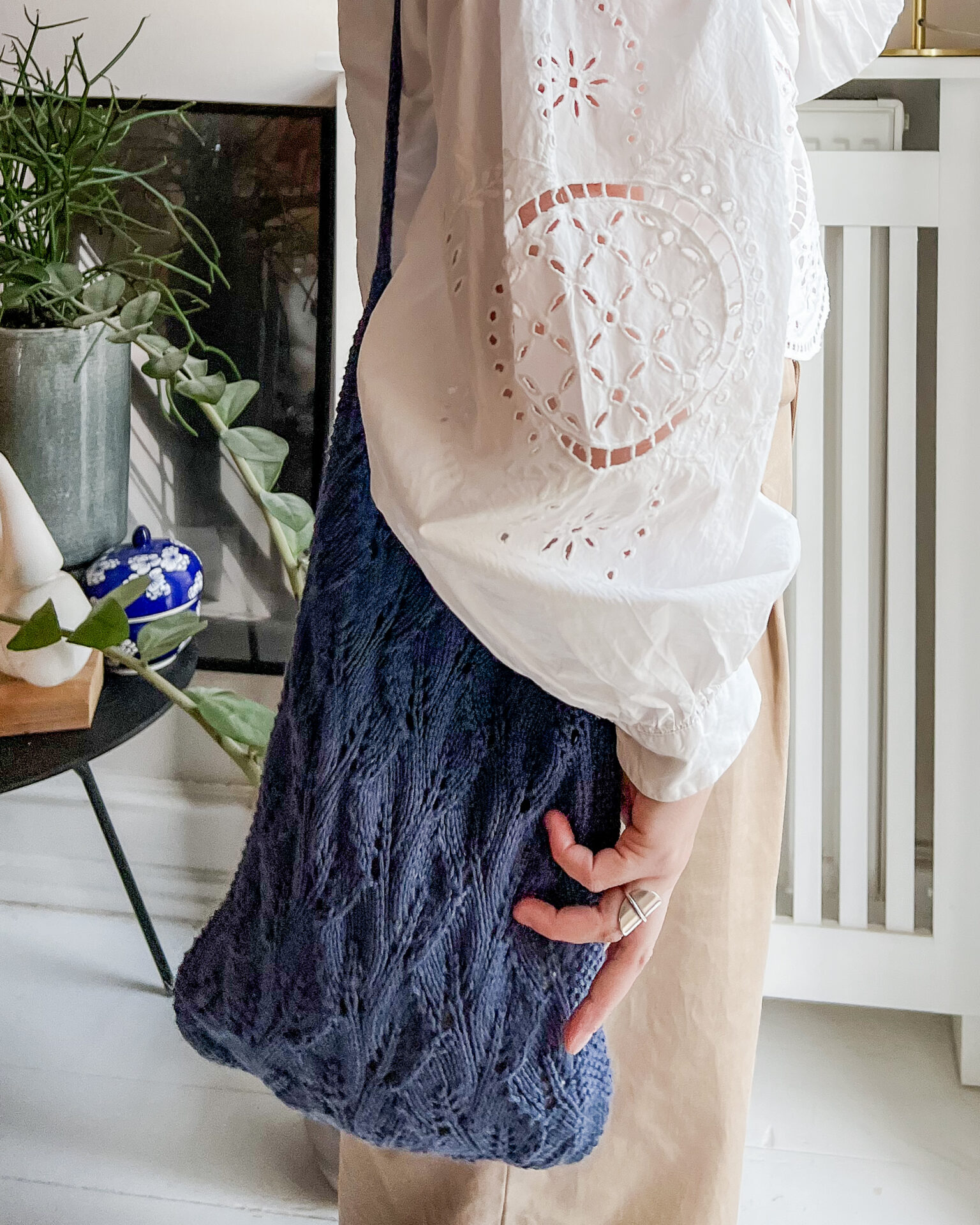 Lille Blad Taske af Dorte Bak strikkes i 150g Norma fra Lang Yarns eller Line fra Sandnes på pind 3,5 mm. Mønsteret er strikket ud fra et diagram og der er videoguides til opskriften.