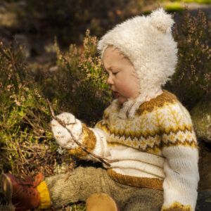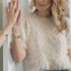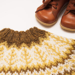 Toppen strikkes i to tråde – én tråd Basta fra Lana Grossa (50 % merinould, 50 % polyamid) og én tråd Astra fra Lang Yarns (60 % polyester, 40 % polyamid). Basta giver varme og struktur, mens Astra tilføjer et luksuriøst skær takket være de indspundne "fake-pels"-fibre. Kombinationen giver et eksklusivt udseende uden at klø eller fnugge – perfekt til dem, der ønsker komfort og stil i én og samme model.