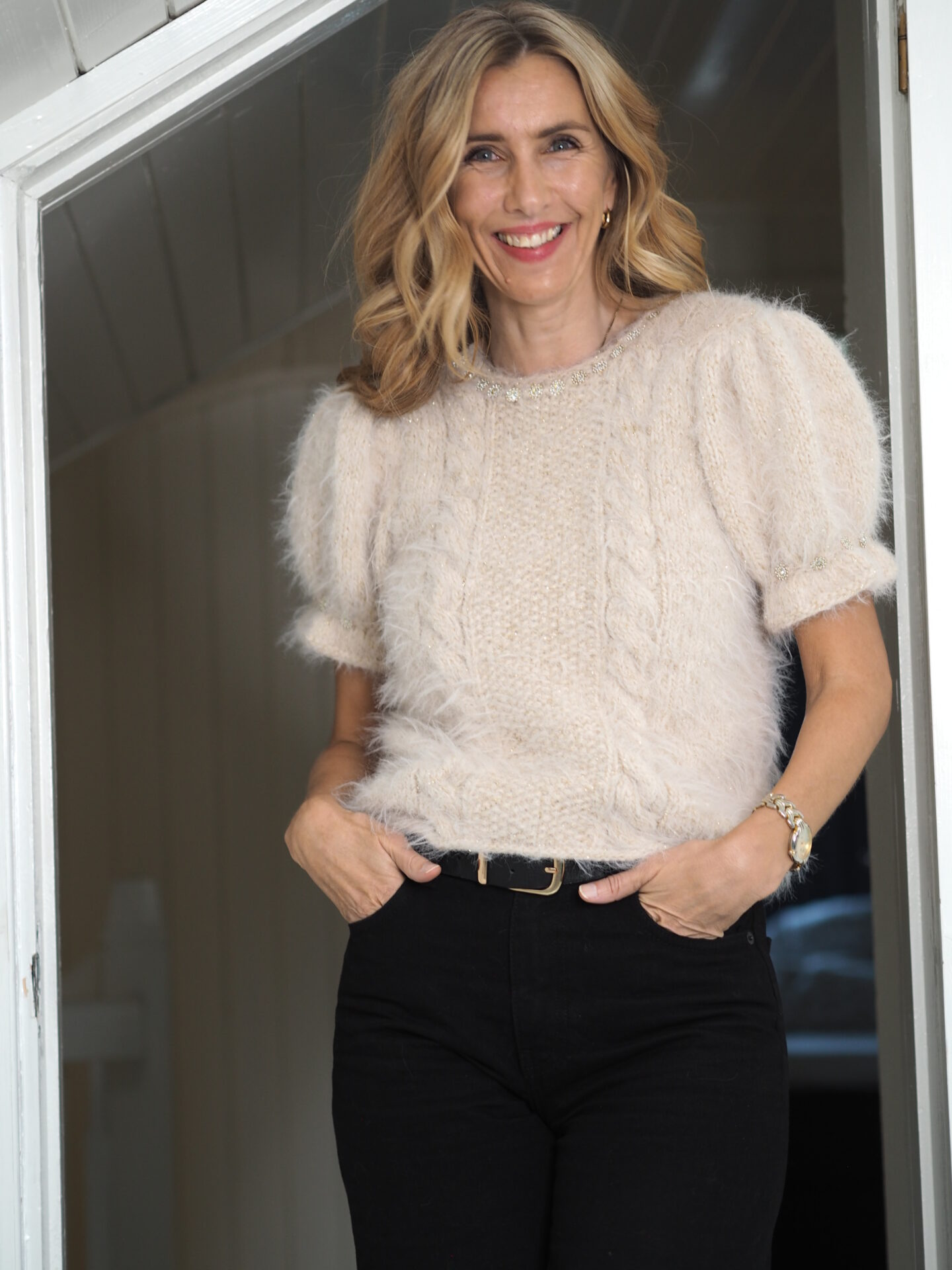 Lindtein Tee er en feminin og stilfuld strikket top, der kombinerer klassisk design med moderne detaljer. Den er designet af Tove Lindtein og udmærker sig ved sine elegante pufærmer og dekorative gulddetaljer. Disse guldelementer kan både strikkes ind og sys på, og de er valgfri – du kan dermed tilpasse udtrykket, så det passer til både festlige anledninger og et mere afdæmpet hverdagslook.