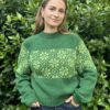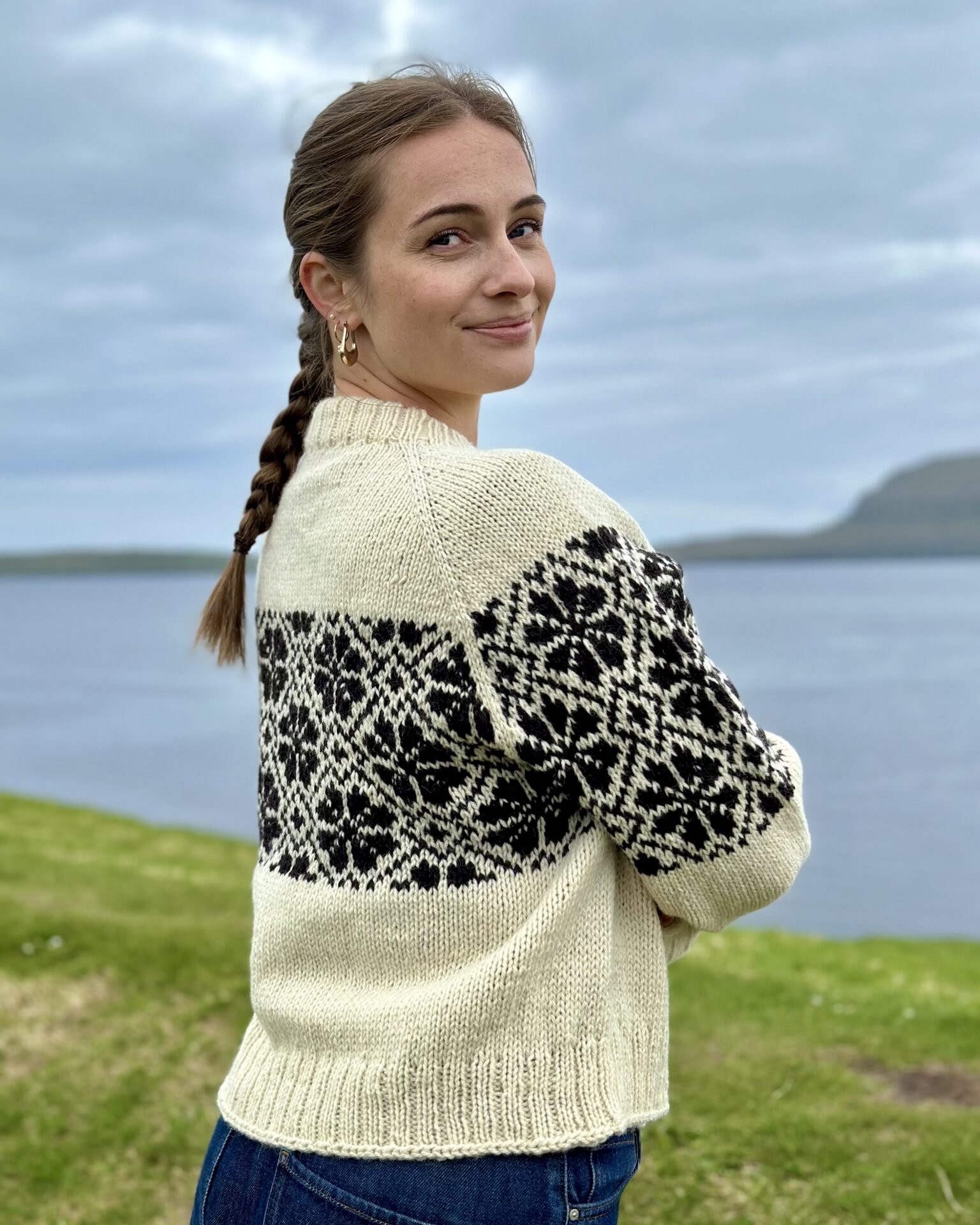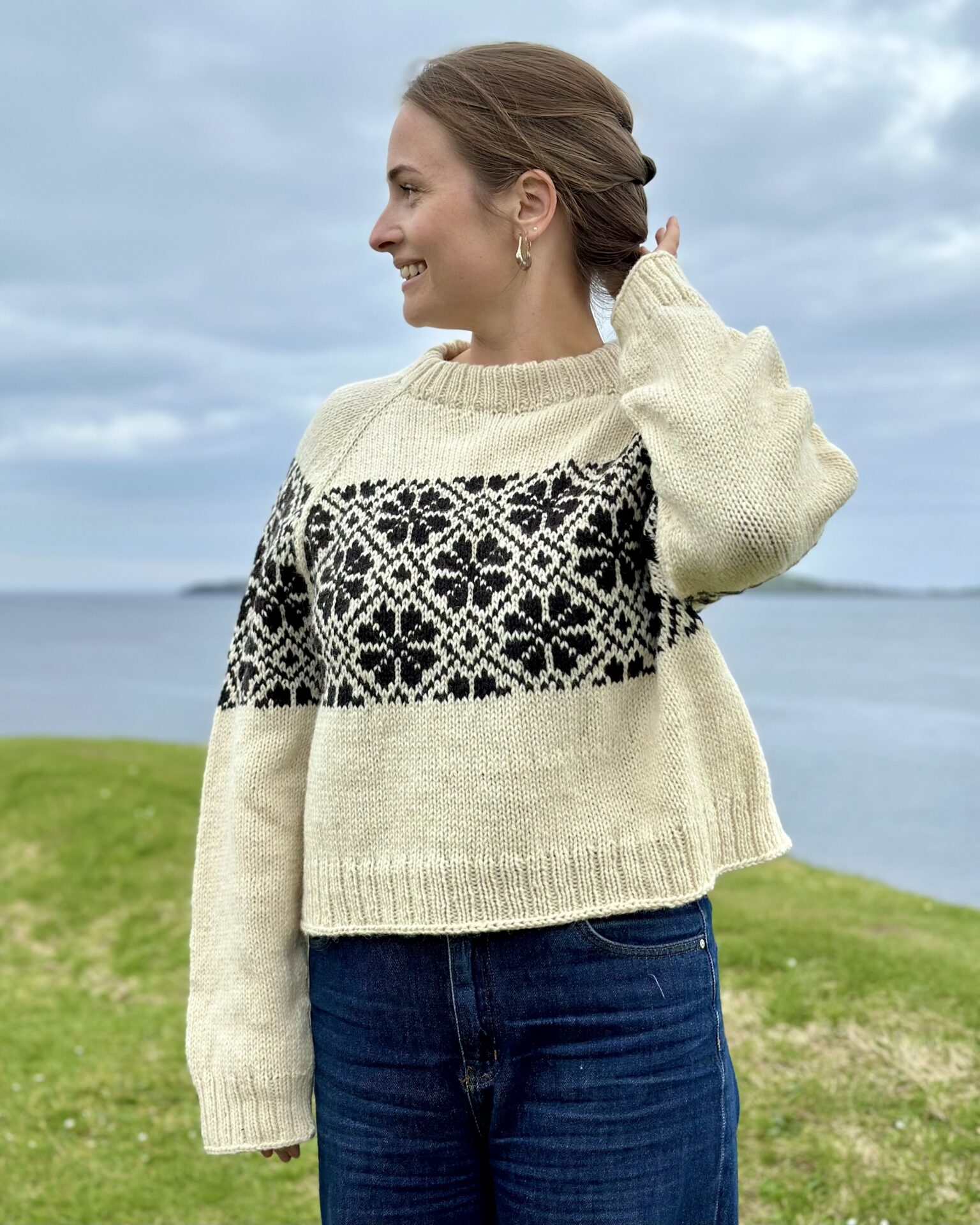 Margrethe Sweater af Knitlidt er en flot raglan sweater med en margueritmønsterbort på bærestykket.