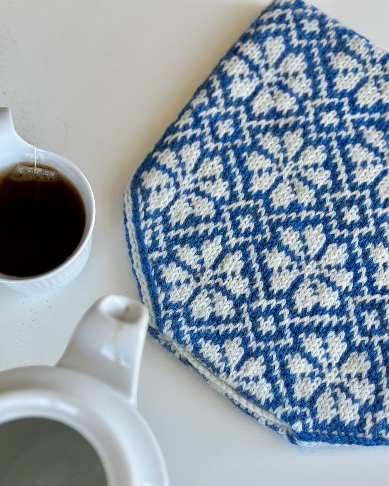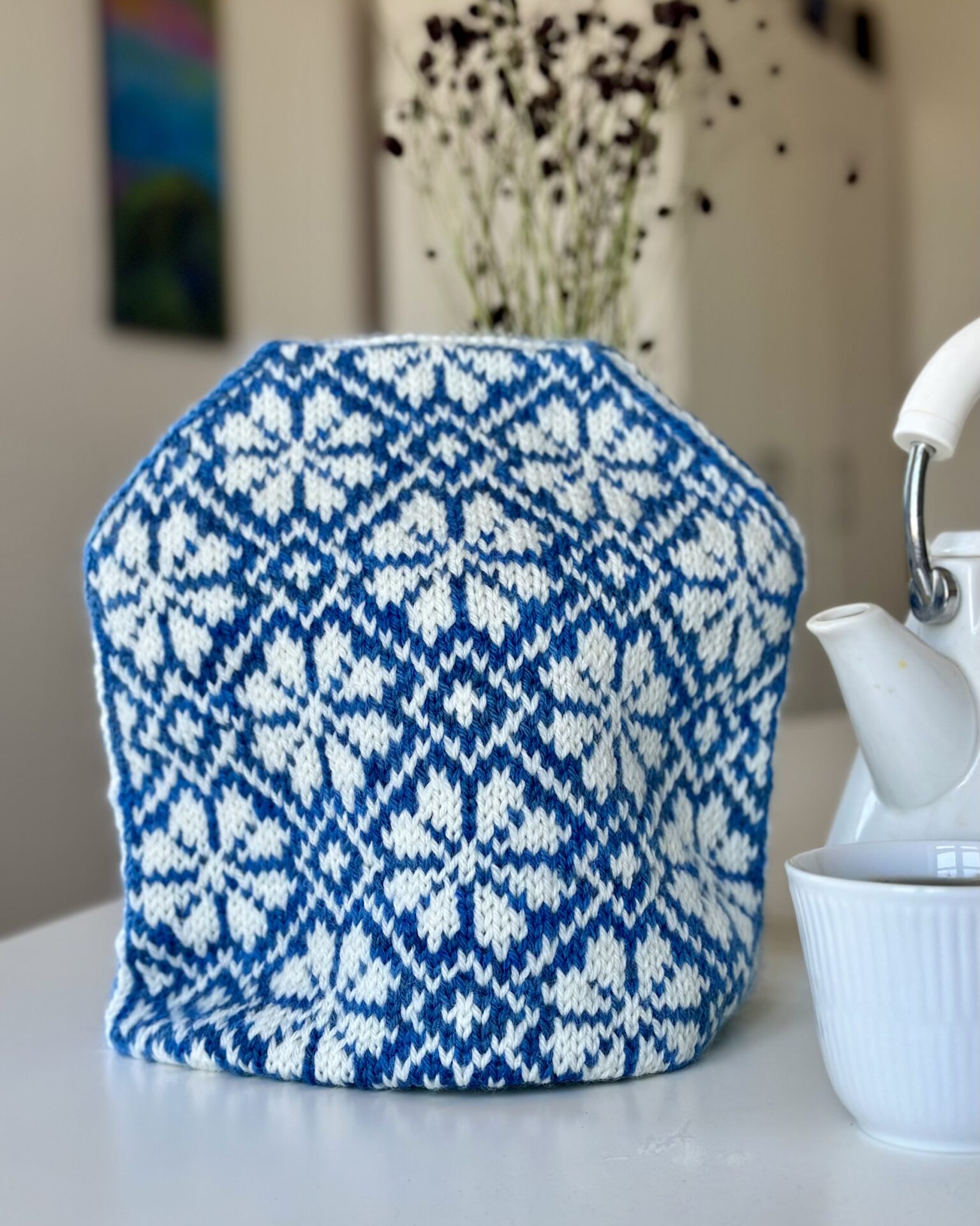 Margrethe Tea Cozy af Knitlidt er en tehætte perfekt til at holde tekanden varm. Hætten er strikket i et margueritmønster til ære for Dronning Margrethe 2.