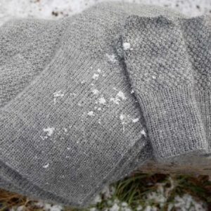 The yarn combination is essential for the Matilda Clutch’s fluffy appearance. It is worked using 40 (50) 70 g of Paris, Nepal eller Big Merino fra Drops (each 50 g = approx. 75 m), held together with 15 (25) 35 g Brushed Alpaca Silk or 10 (20) 30 g Kid-Silk. The combination creates an airy, soft fabric with excellent body and structure. Gauge is 16 sts × 20 rows on 5 mm needles in bubble stitch and double knitting, ensuring the clutch maintains its shape.
