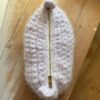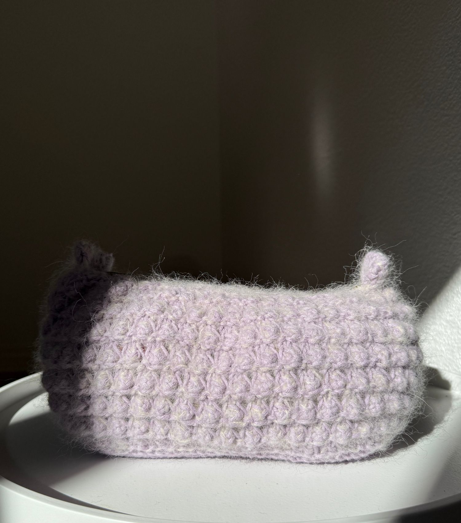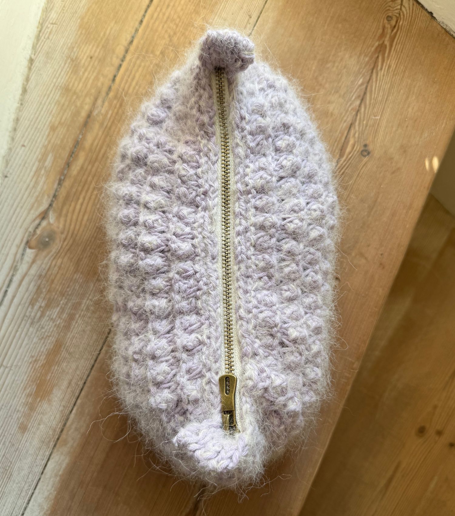 The base is knitted in double knitting, creating a firm and stable foundation. Stitches are then picked up along all edges and worked in the round using the bubble stitch pattern. This stitch gives the clutch its signature plush texture and makes it both visually appealing and pleasant to hold.