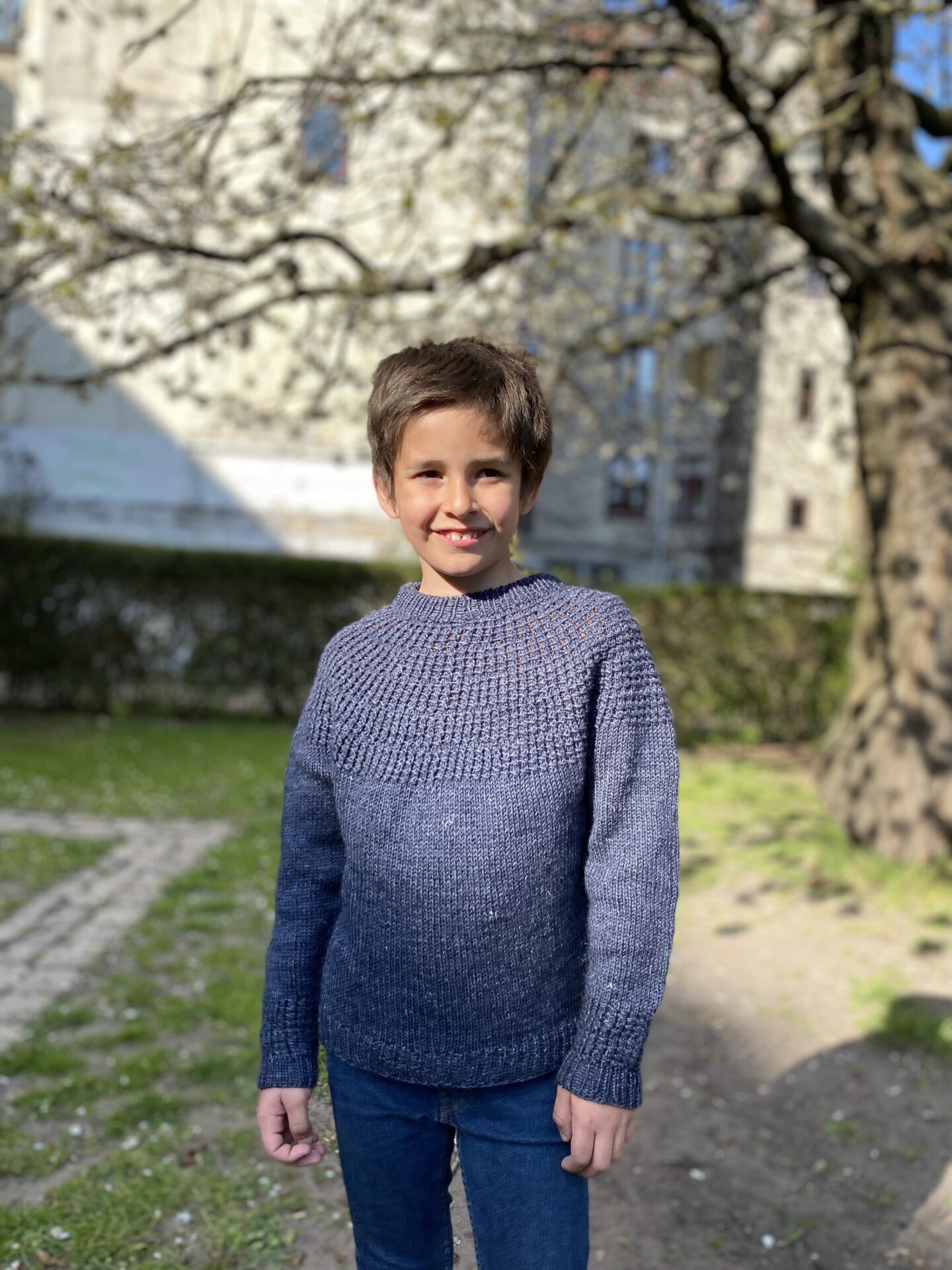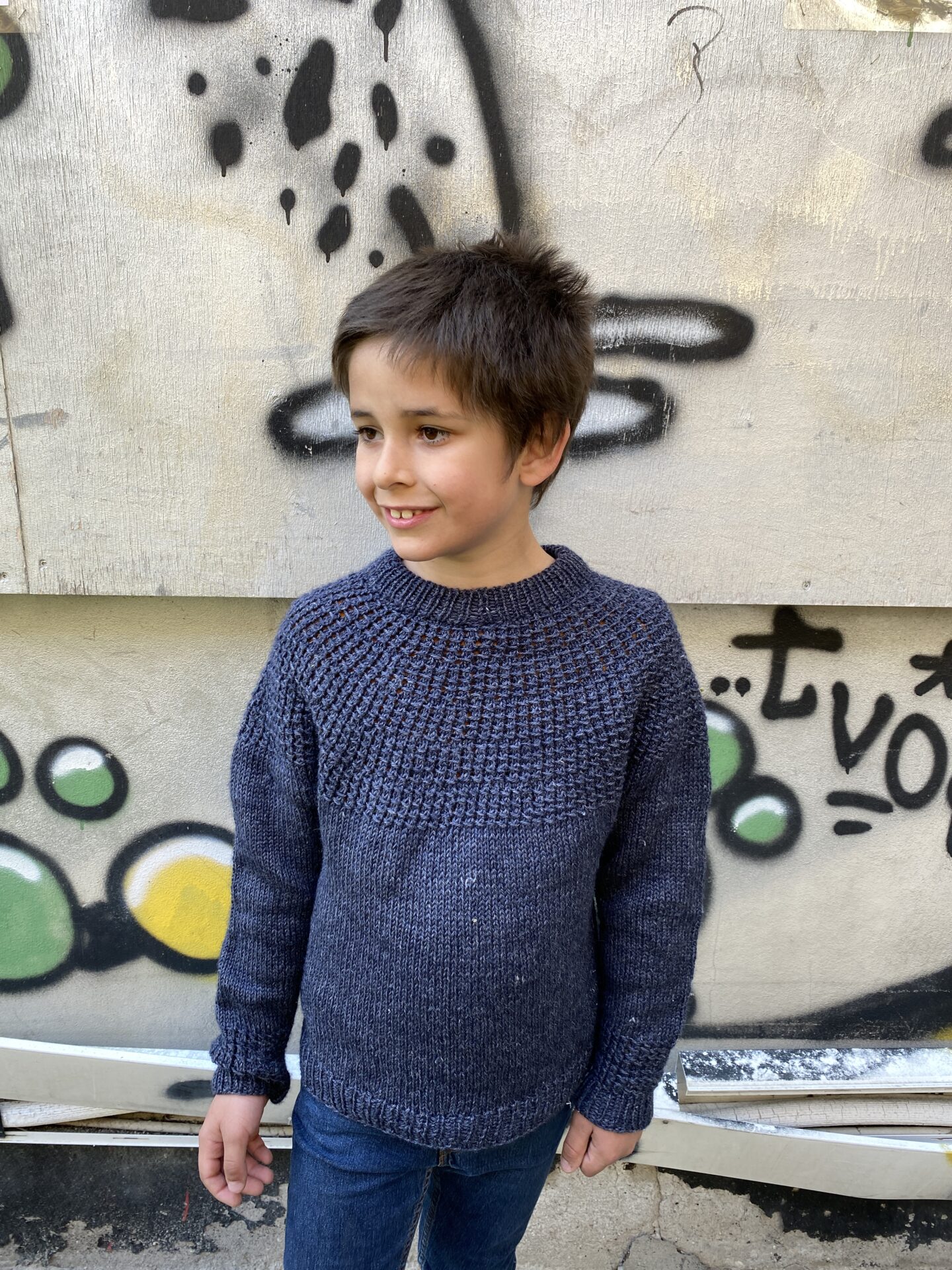Matteo Sweater Junior fra Kracun Knitwear strikkes med 1 tråd Double Sunday fra Sandnes på 3.50 og 4.00 mm pind.