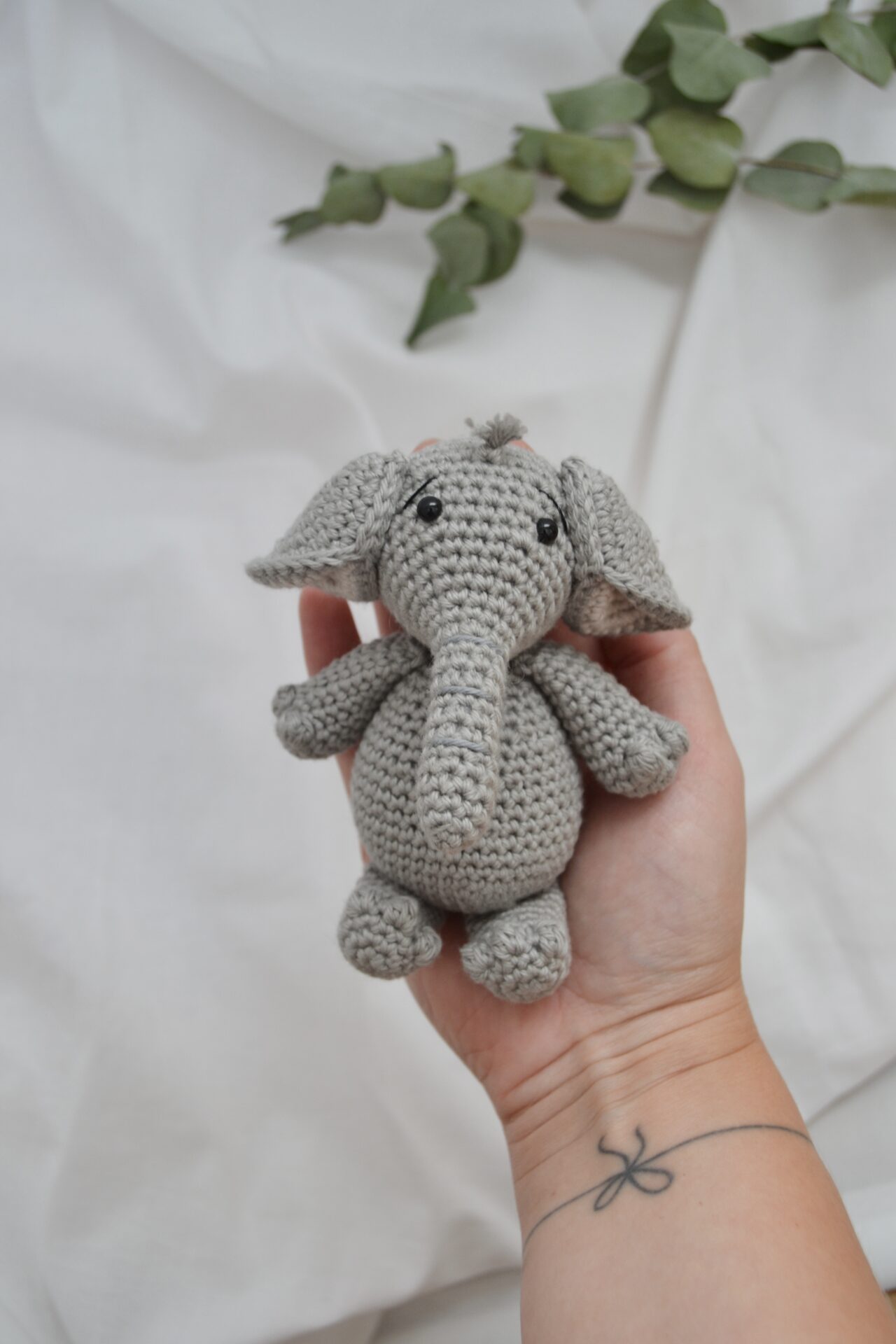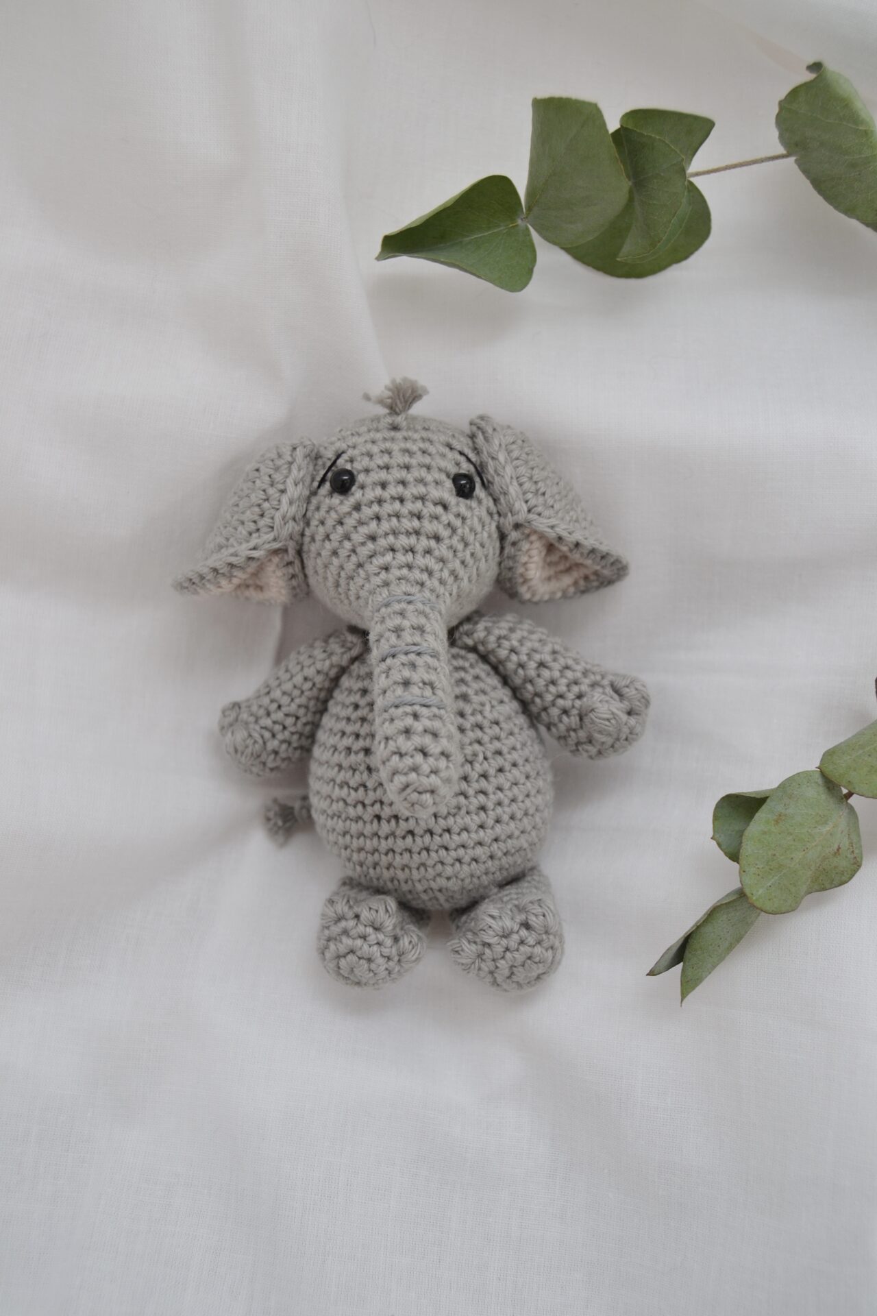 Mini Elliot fra By Trine Møller er bedårende hæklet bamse. Elefantbamsen hækles i enkelte dele og monteres til sidst.