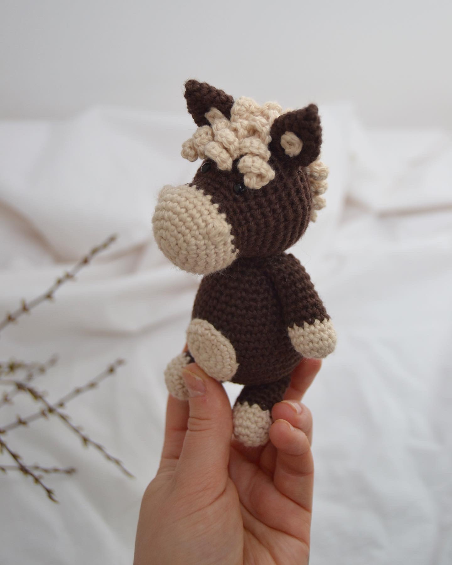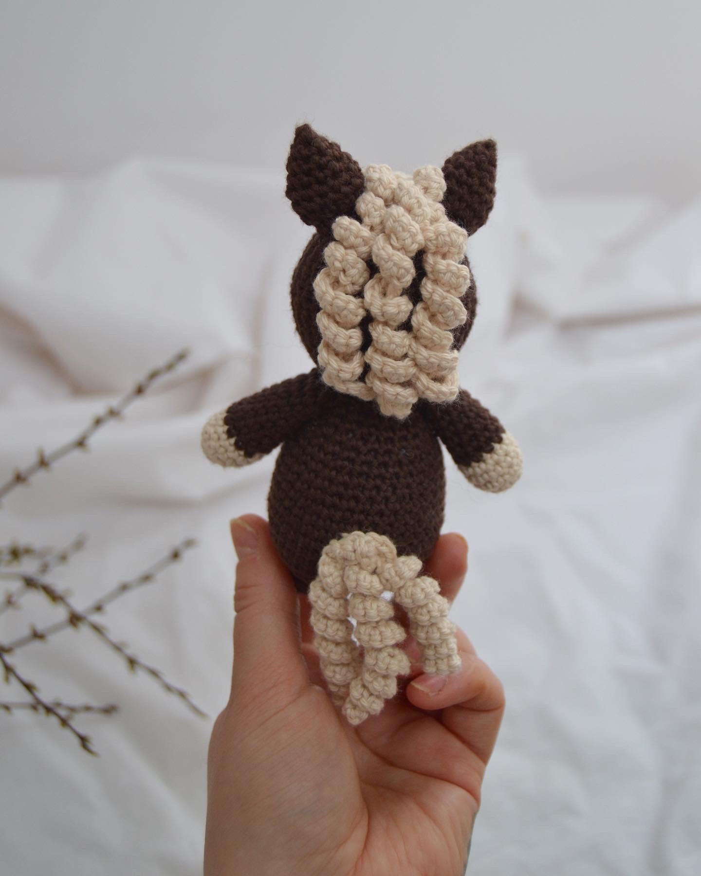 Mini Hilda fra By Trine Møller er en nuttet lille hæklet heste-bamse. Du kan lave hende til dine egne børn, eller give hende i gave til en du holder af.