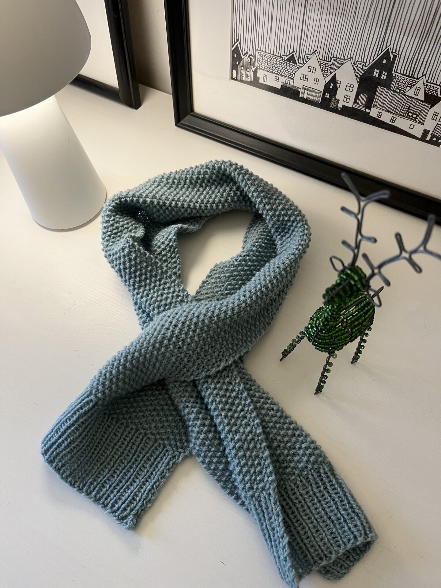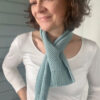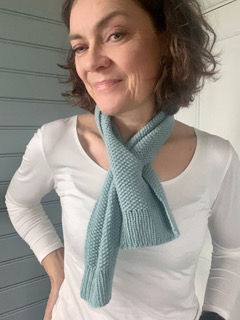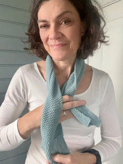 Lækkert lille scarf strikket i perlestrik og med et twist i den ene ende, så det er let at ”binde”. Der er kun brugt 50 g garn, men i lækker Cashmere Premium fra Lang Yarns.