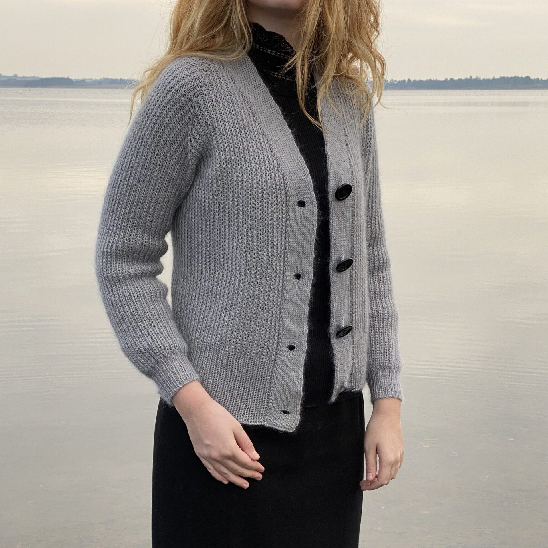 En super skøn cardigan strikket i halvpatent. Cardiganen strikkes oppefra og ned, og knaphulskanten er strikket i dobbeltstrik, så den ingen vrangside har. Cardiganen er strikket i en tråd alpakka og en tråd Silk Mohair, hvilket giver et eksklusivt og blødt look. Det er en elegant og simpel cardigan som går til det meste, hvis ikke det hele. Ned langs midten er der 4 knapper, som bruges til at lukke og åbne trøjen.
