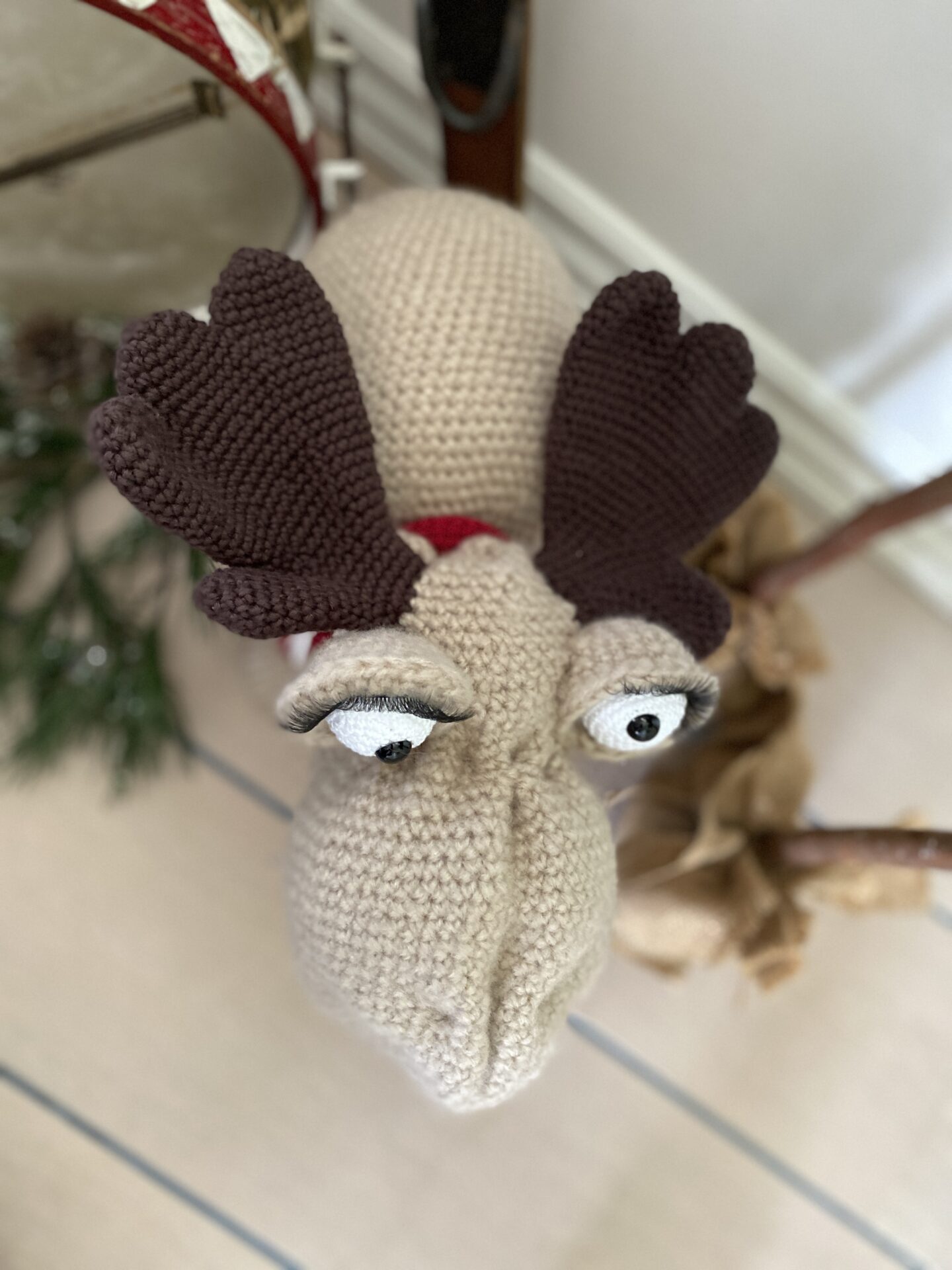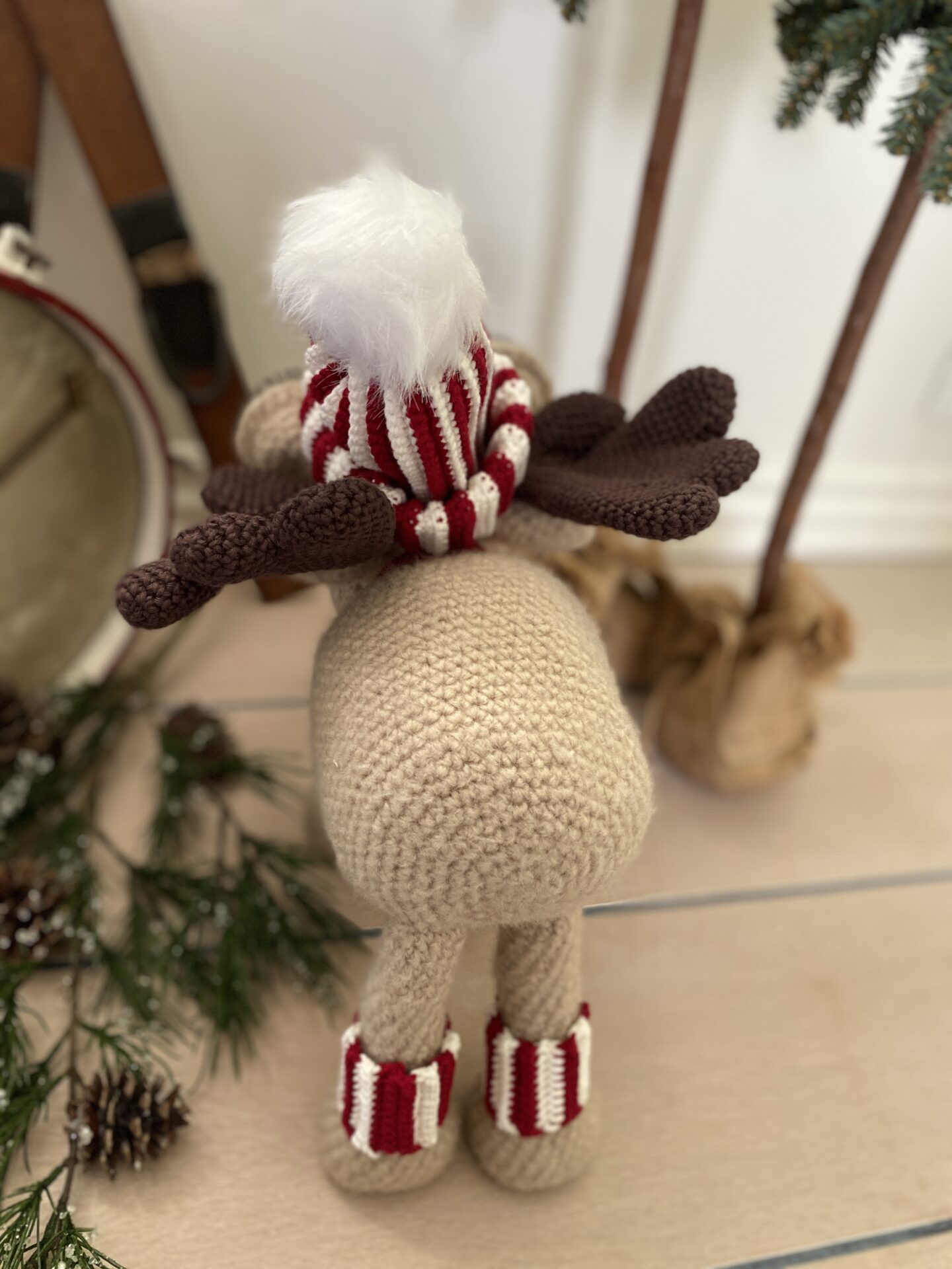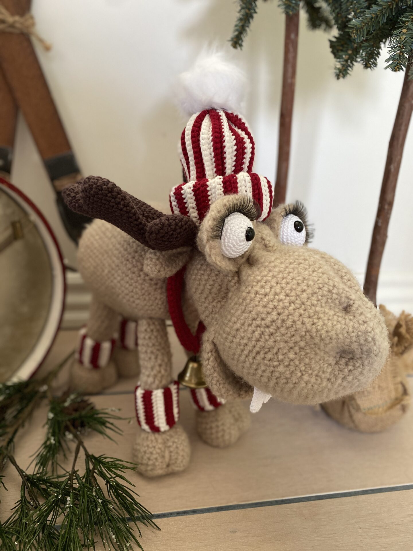 Moosen fra Trines Makværk er en uimodståelig og charmerende hæklefigur, der med sine cirka 40 cm i højden inklusive hue og omkring 34 cm i længden med garanti vil stjæle opmærksomheden, uanset hvor han placeres. Han er ikke bare et sjovt og dekorativt indslag til juletiden – han er en elskelig karakter, der bringer hygge og personlighed ind i hjemmet. Med sit varme udtryk, søde øjne og flotte gevir er han den perfekte ledsager i den kolde vintertid.
