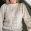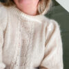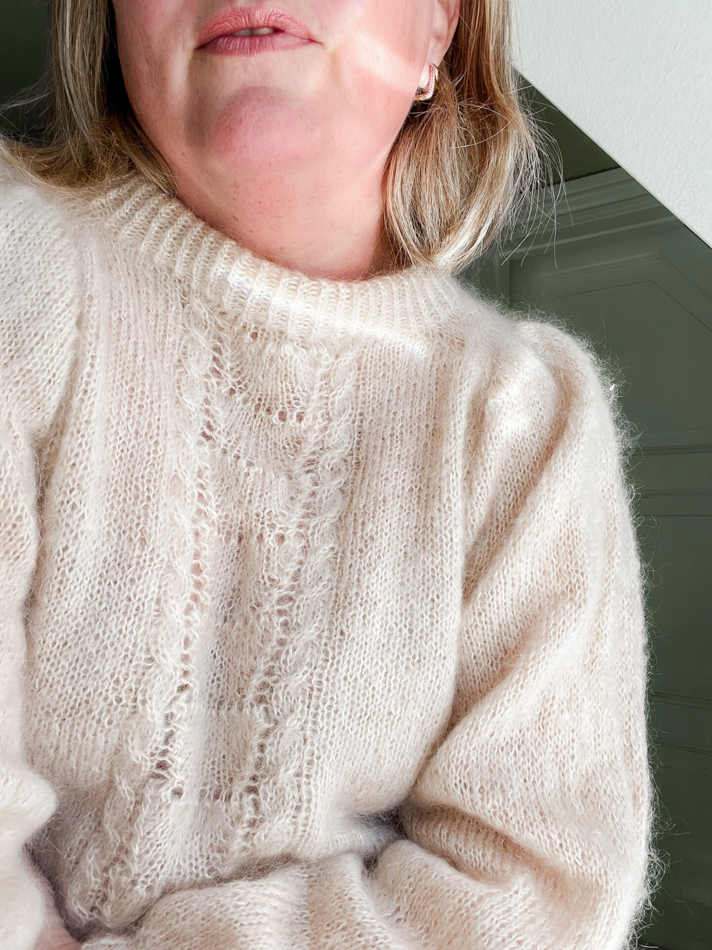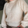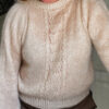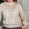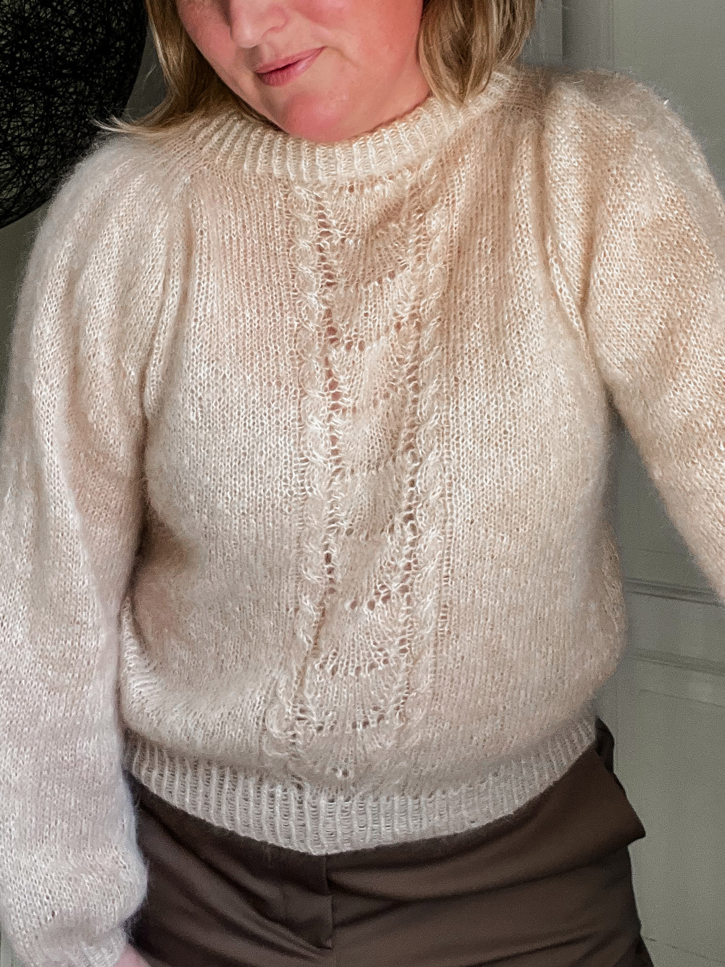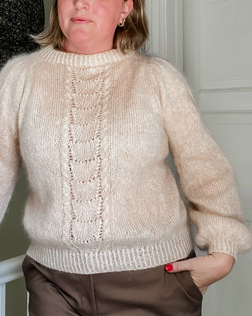 The construction includes carefully placed increases in the front and back, creating a refined structure without adding bulk to the shoulders. The puff sleeves are formed with short rows and shaping increases, and the front panel features a 12-row repeat pattern combining cables and eyelets that creates the signature “clam” look.