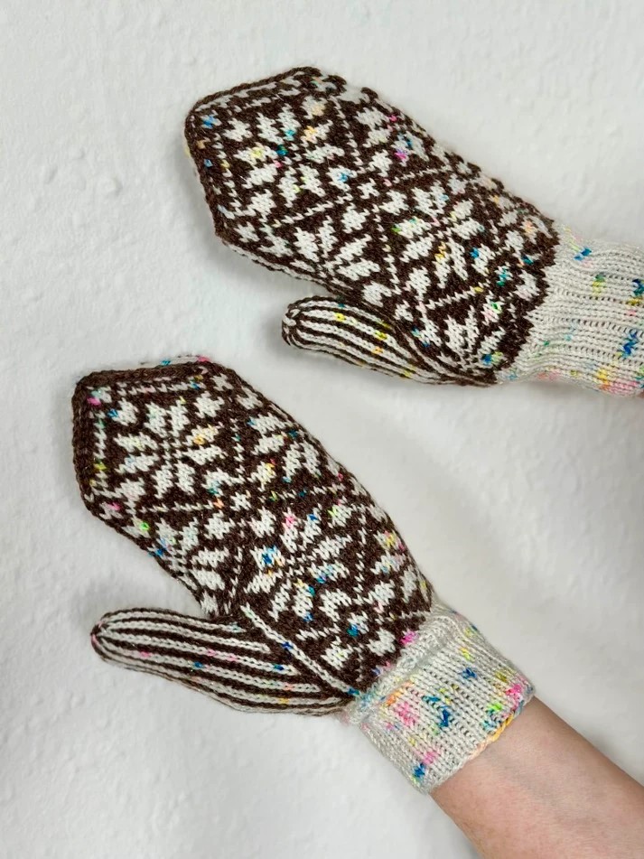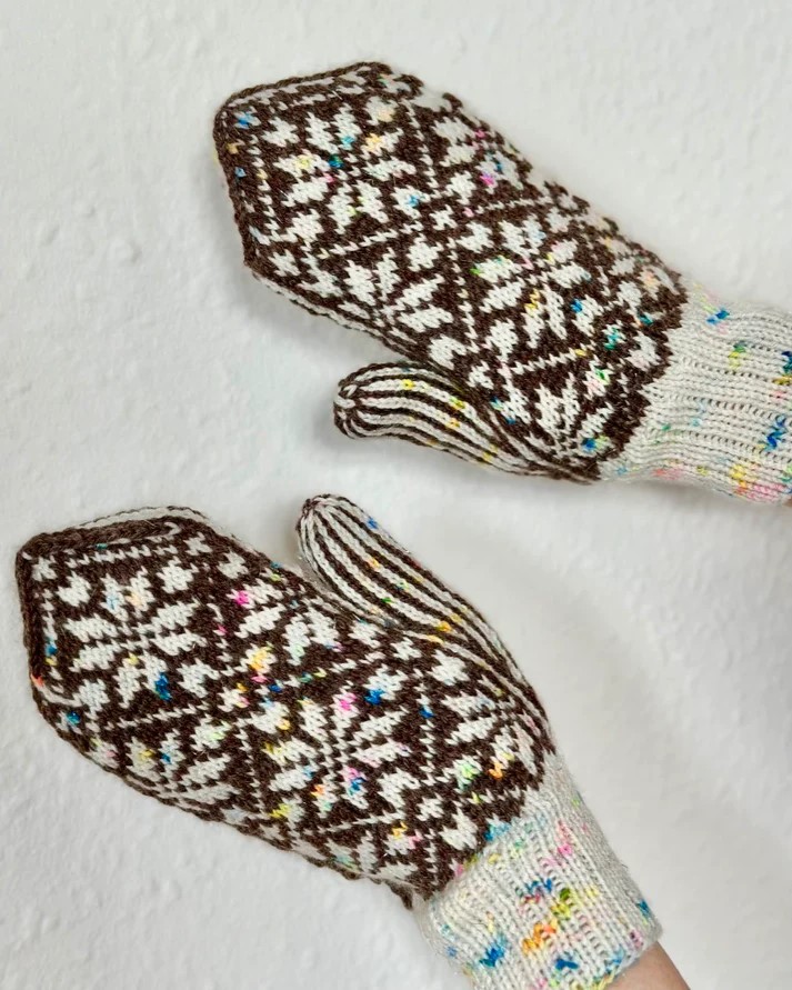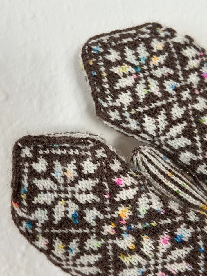 Nora Mittens Junior er et par børneluffer med et nordisk inspireret stjernemønster, som er perfekt til efterår og vinter. Man kan strikke lufferne i fire forskellige størrelser.