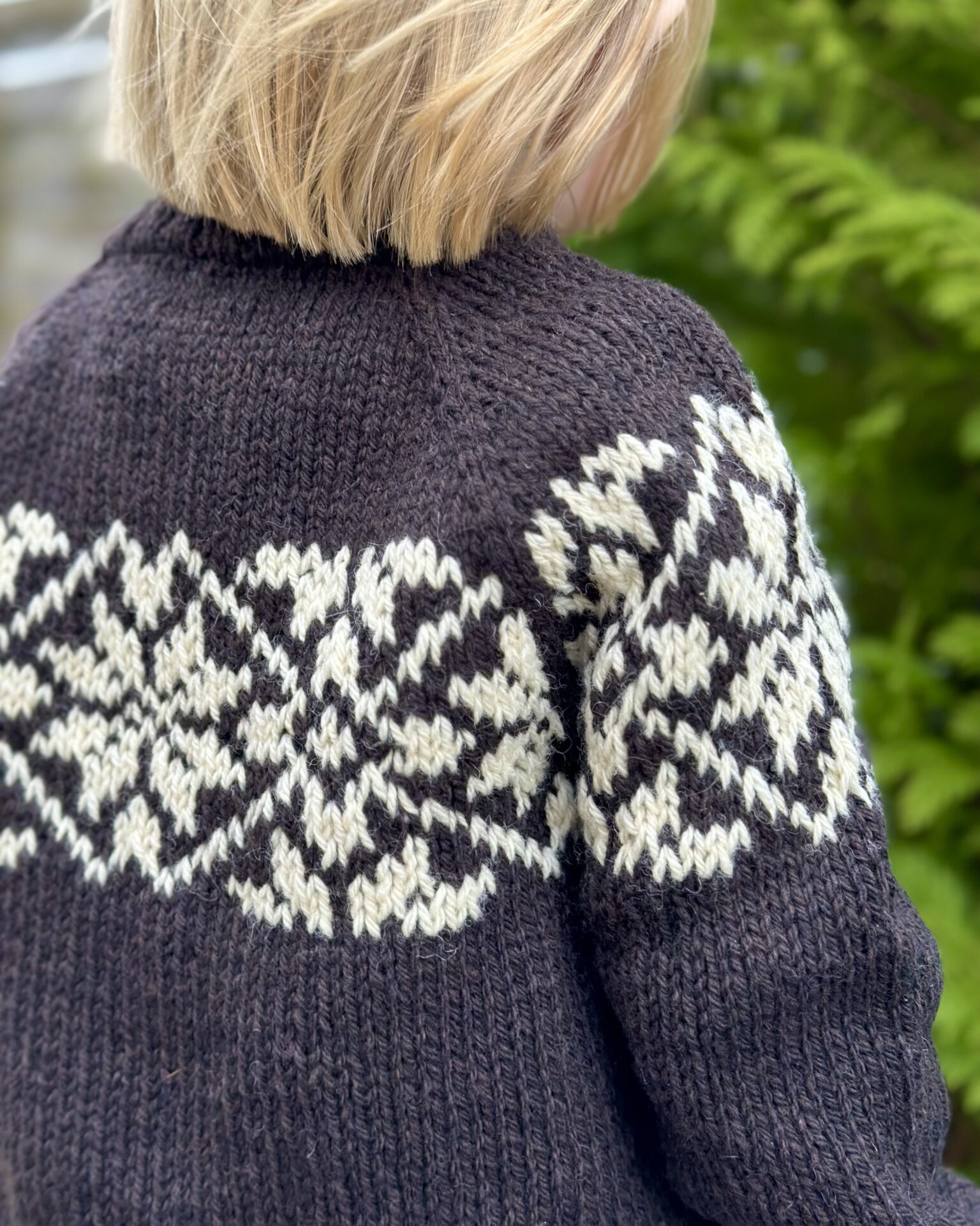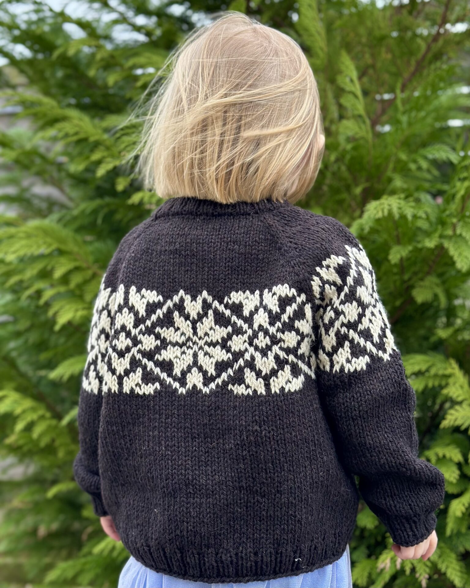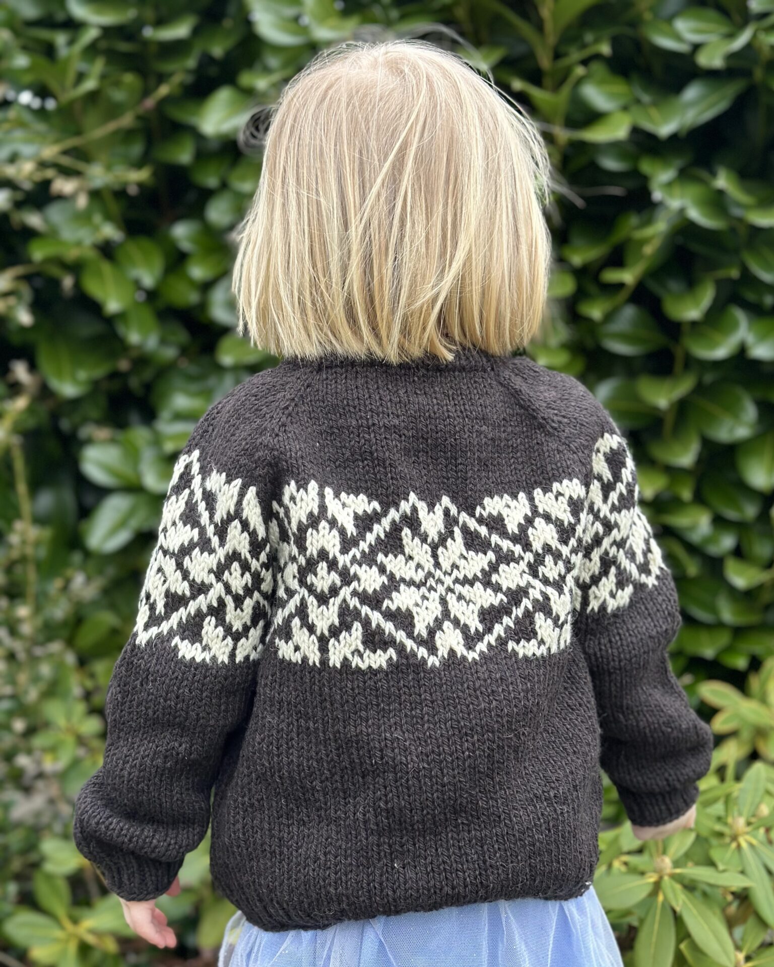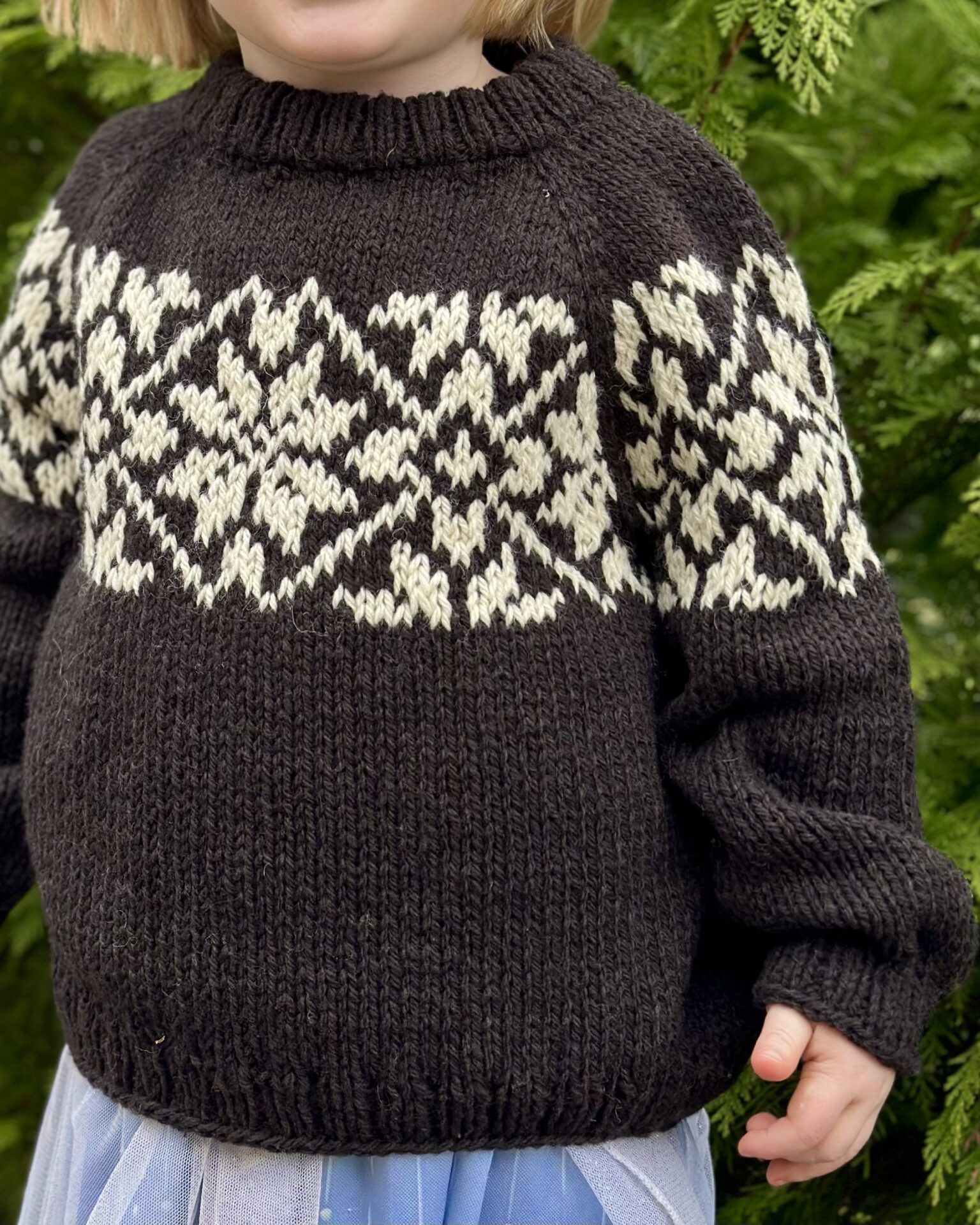 Nora Sweater Junior er en flot børnesweater med nordisk mønsterbort på bærestykket, strikket oppefra og ned med raglanudtagninger og tyskervendinger. Den har løs pasform med ca. 14 cm bevægelsesrum, så barnet kan bevæge sig frit. Sweateren strikkes i enten Trio fra Navia (50 g = 120 m) eller Peruvian fra Filcolana (50 g = 100 m), på rundpind 4 mm, 4,5 mm og 5,5 mm. Strikkefasthed: 17 masker x 22 pinde = 10 x 10 cm. Fås i størrelser 1½ til 12 år.