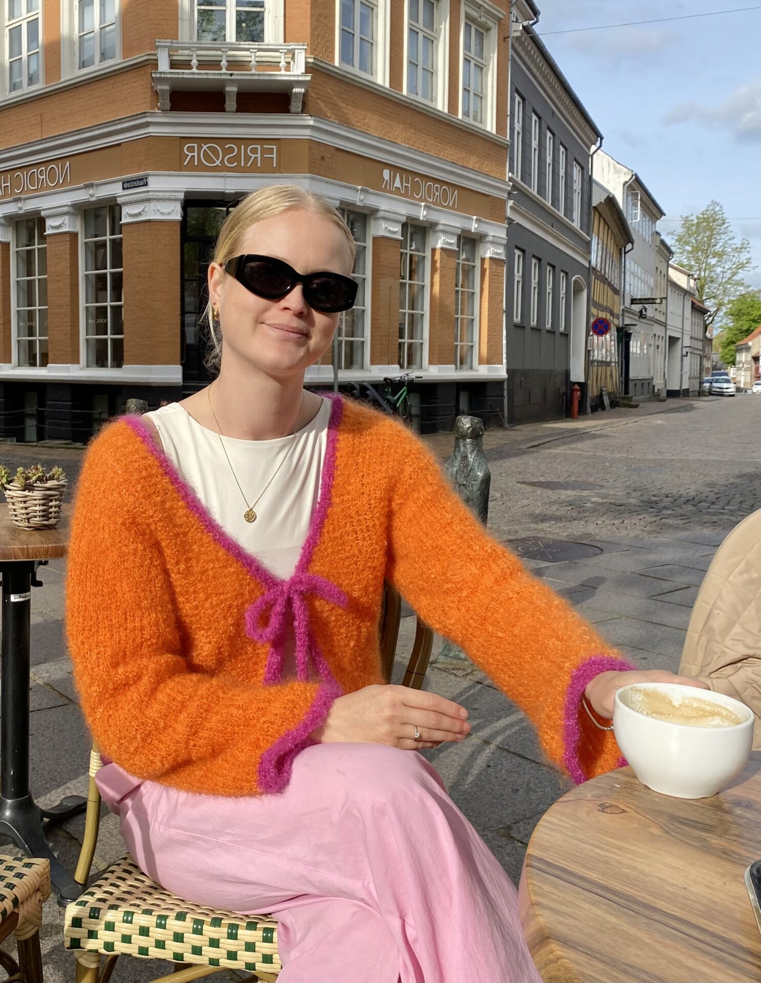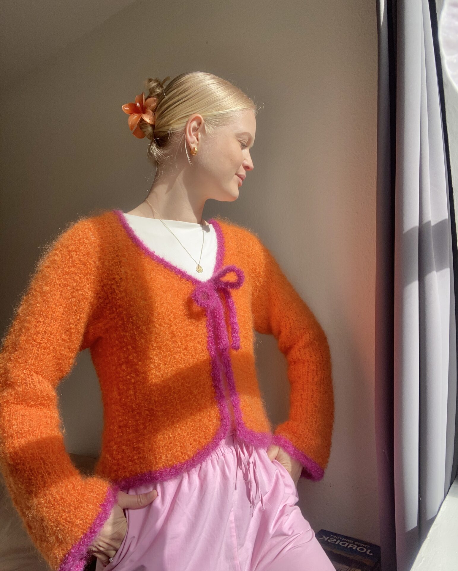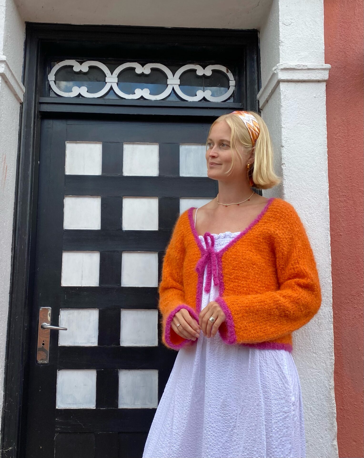 Cardiganen strikkes nedefra og op på pind 7 mm. I opskriften strikkes kroppen i én farve og kanterne i en kontrast farve, ønsker du et mere neutralt look, kan du med fordel strikke det hele i samme farve. Cardiganen er loose fit og oversized og én størrelse kan derfor passes af flere former og størrelser.