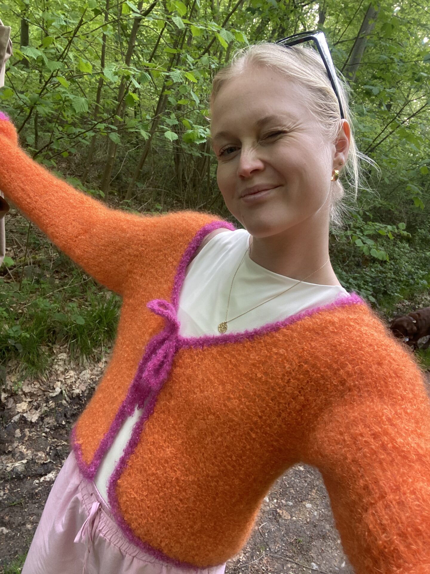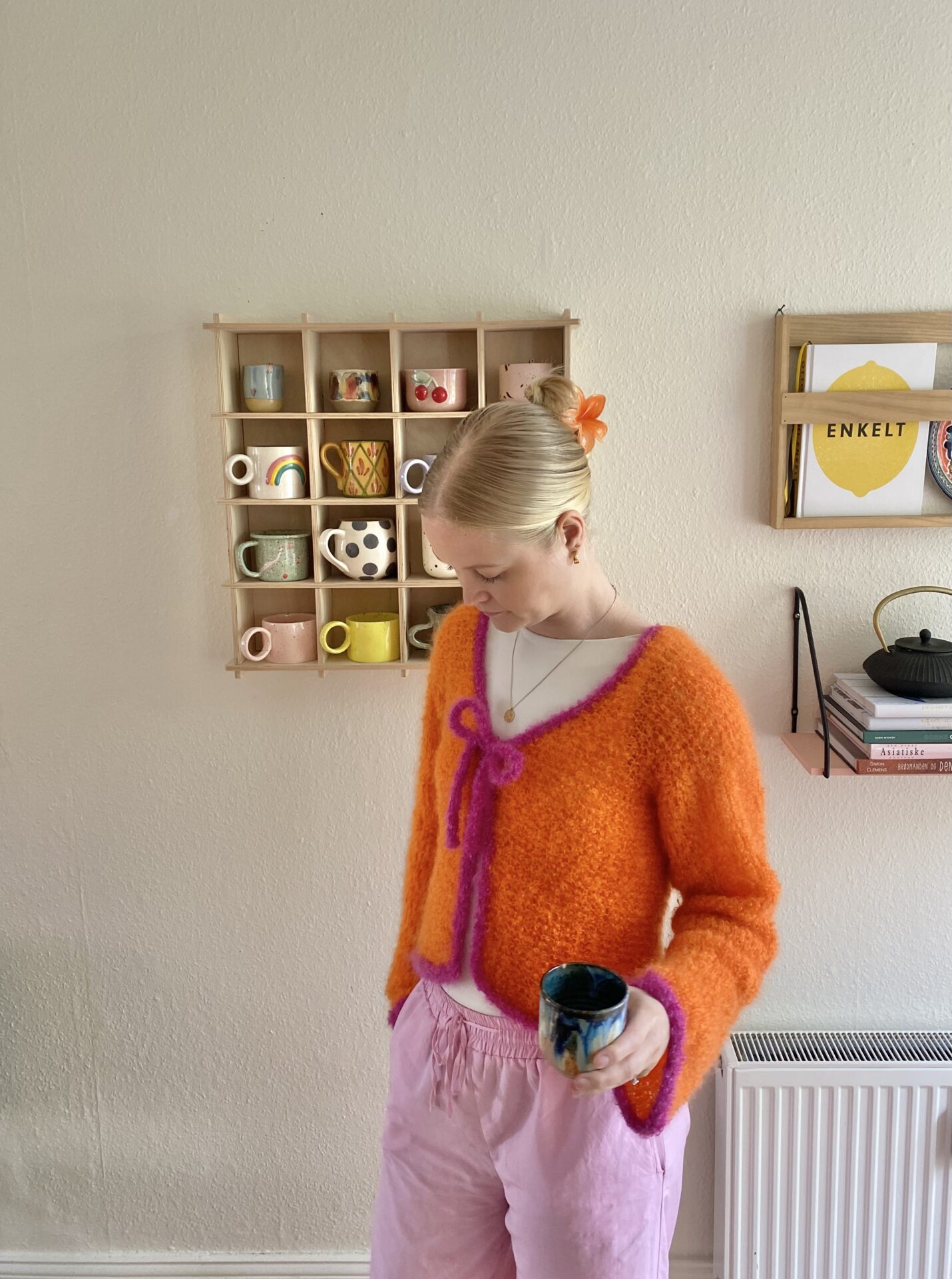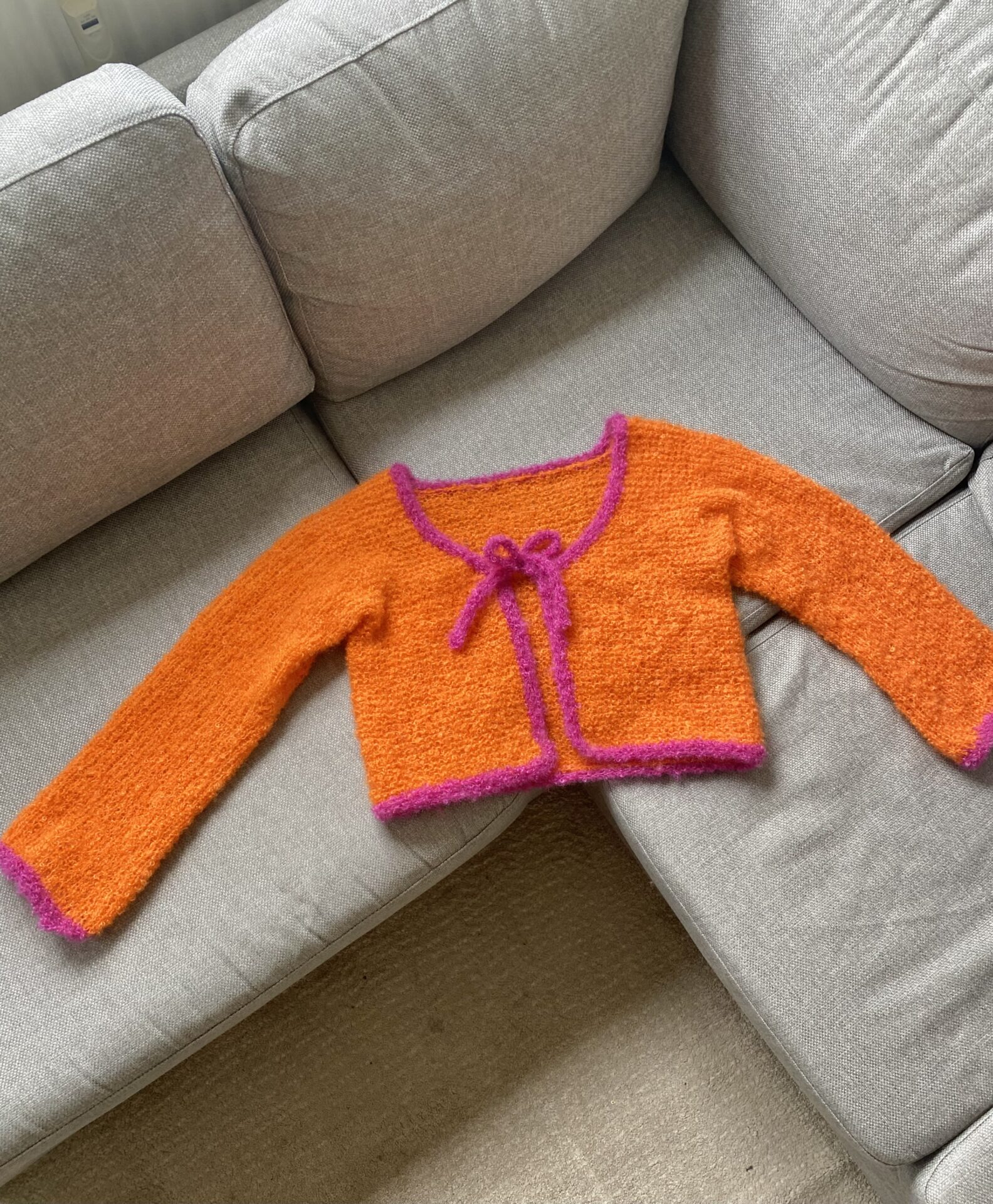 Cardiganen strikkes nedefra og op på pind 7 mm. I opskriften strikkes kroppen i én farve og kanterne i en kontrast farve, ønsker du et mere neutralt look, kan du med fordel strikke det hele i samme farve. Cardiganen er loose fit og oversized og én størrelse kan derfor passes af flere former og størrelser.