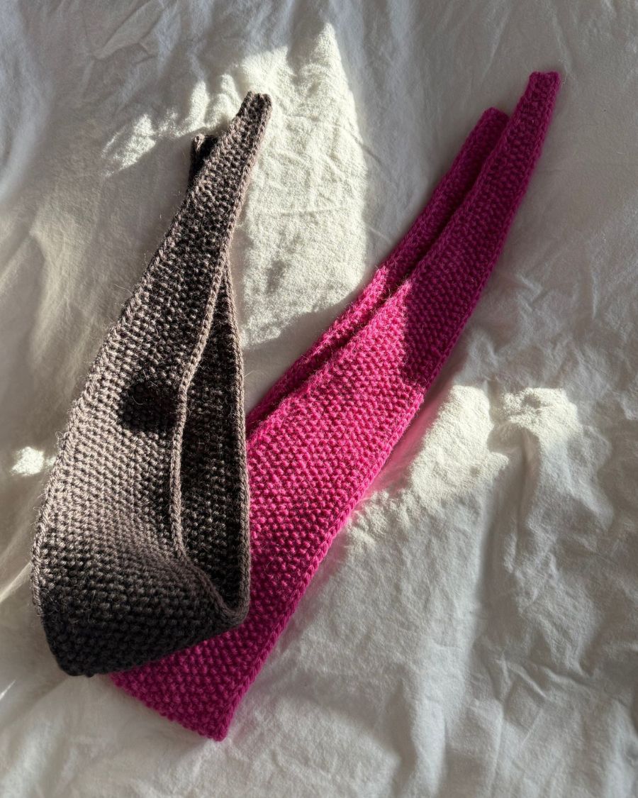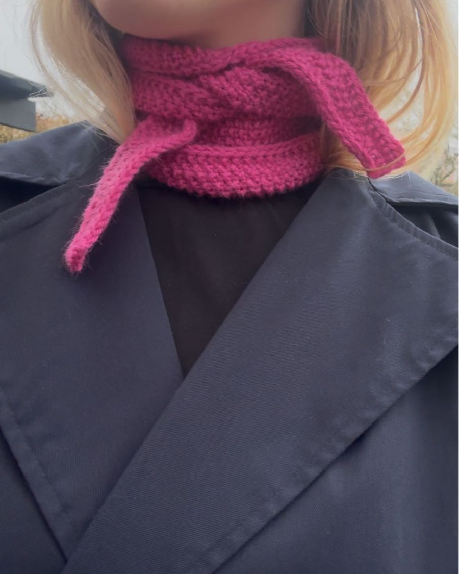 Det smukke perlestrik-mønster dannes ved at skiftevis strikke ret og vrang på hver pind og strikke modsat på næste pind – det giver et ensartet og teksturrigt udtryk. Tørklædet afsluttes med en elegant spids og fast i-cord kant, som giver det et professionelt og færdigt look.