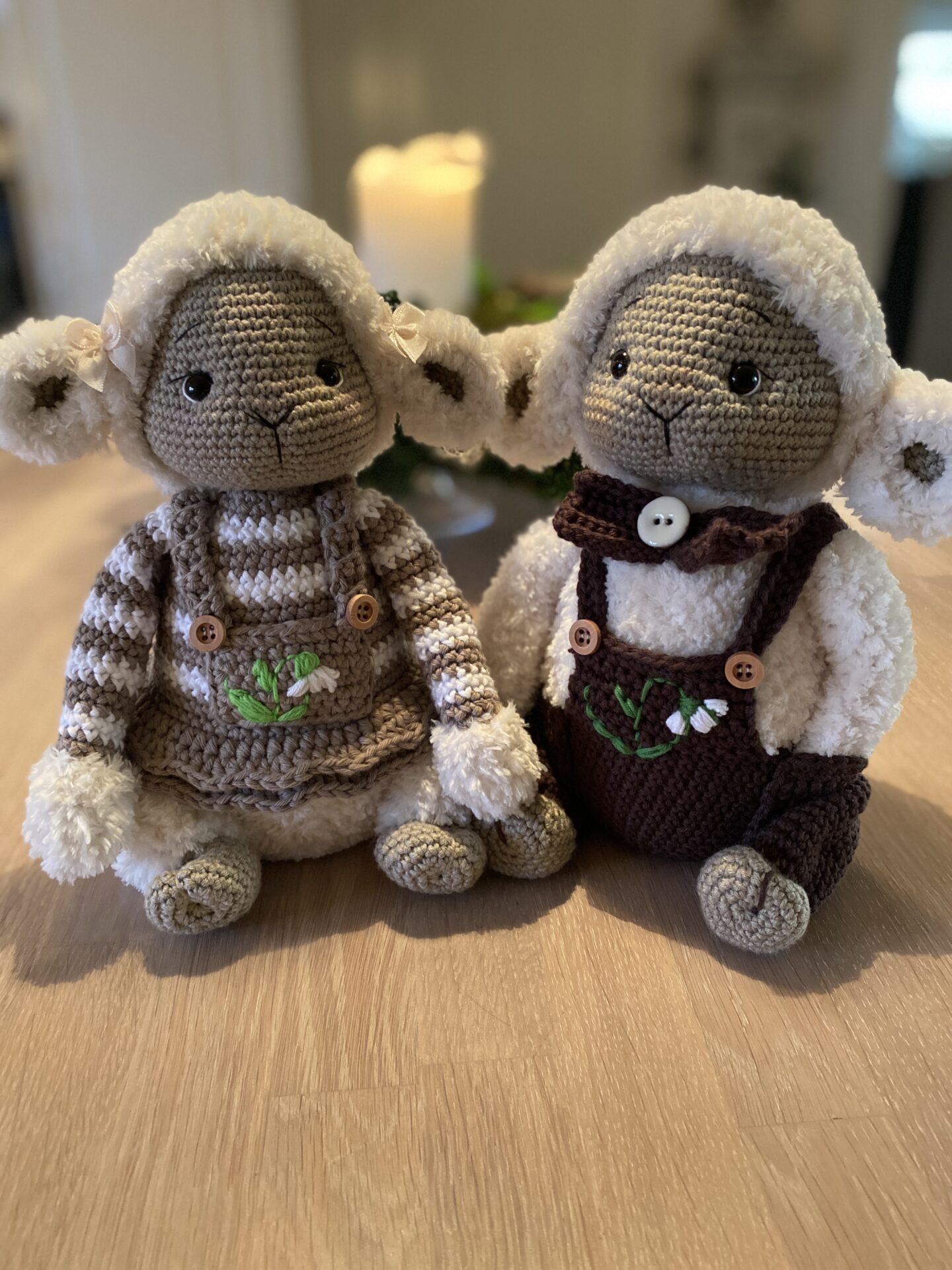 Fåret hækles primært i Teddy Polyestergarn i hvid til kroppen, benene, armene og det fluffy uldhoved. Alternativt kan du bruge Velvet Soft fra LindeHobby i farve 2 (hvid). Til klove, hoved og ører anvendes Acacia fra Hobbii i farve 04 (beige), mens kjolen og alle detaljer er lavet i Yarn and Colors Epic 8/8 i farverne Clay (fv. 005) og Marble (fv. 102). Garnet kan nemt erstattes med andet bomuldsgarn i 8/8 og 8/4 tykkelse.