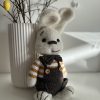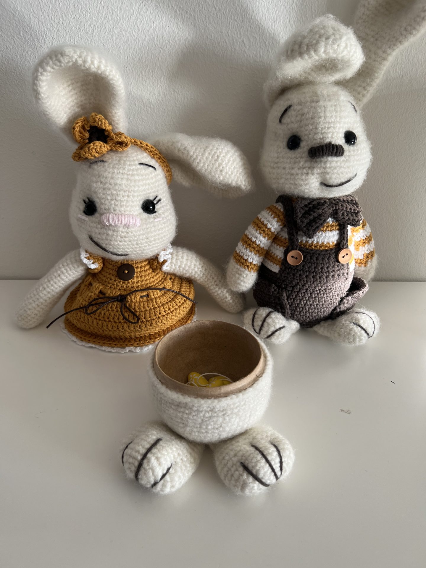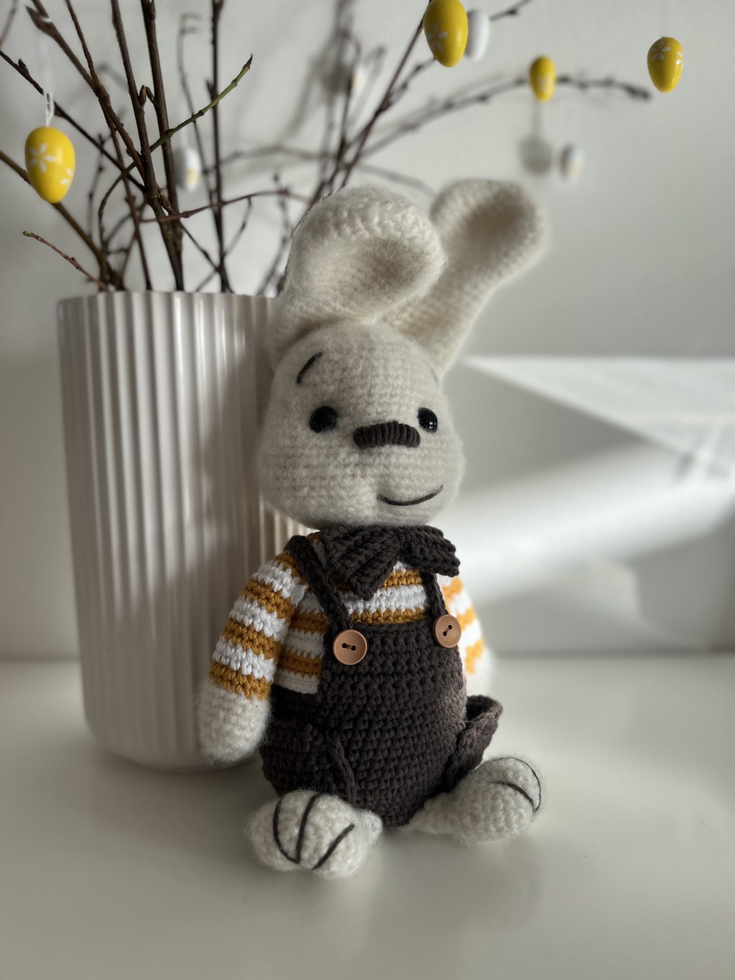 Denne flotte påskekanin er hæklet omkring et pap-æg, så den inden i er plads til små hemmeligheder og skatter. Påskekaninen er klædt i en stribet trøje samt overtræksbukser og en butterfly til.