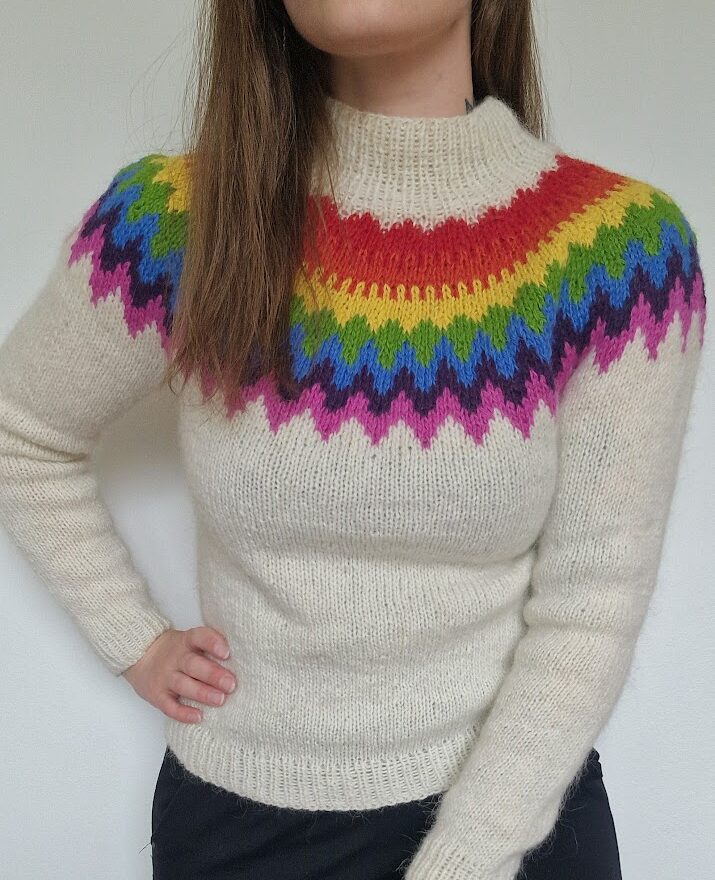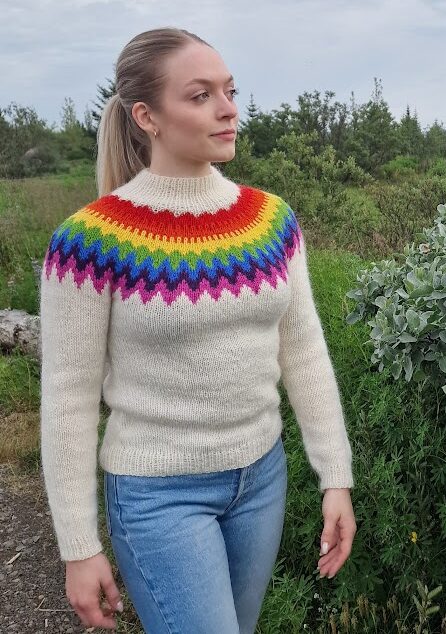 The Regnbogi Lopapeysa (Rainbow Sweater) is a stunning Icelandic knitting design created by Rakel from Lopamunstur.is. This pattern is a celebration of colors, inspired by the rainbow, and knitted in the traditional lopapeysa style. Worked from the bottom up in the round, the sweater combines timeless Icelandic knitting heritage with modern vibrancy.