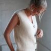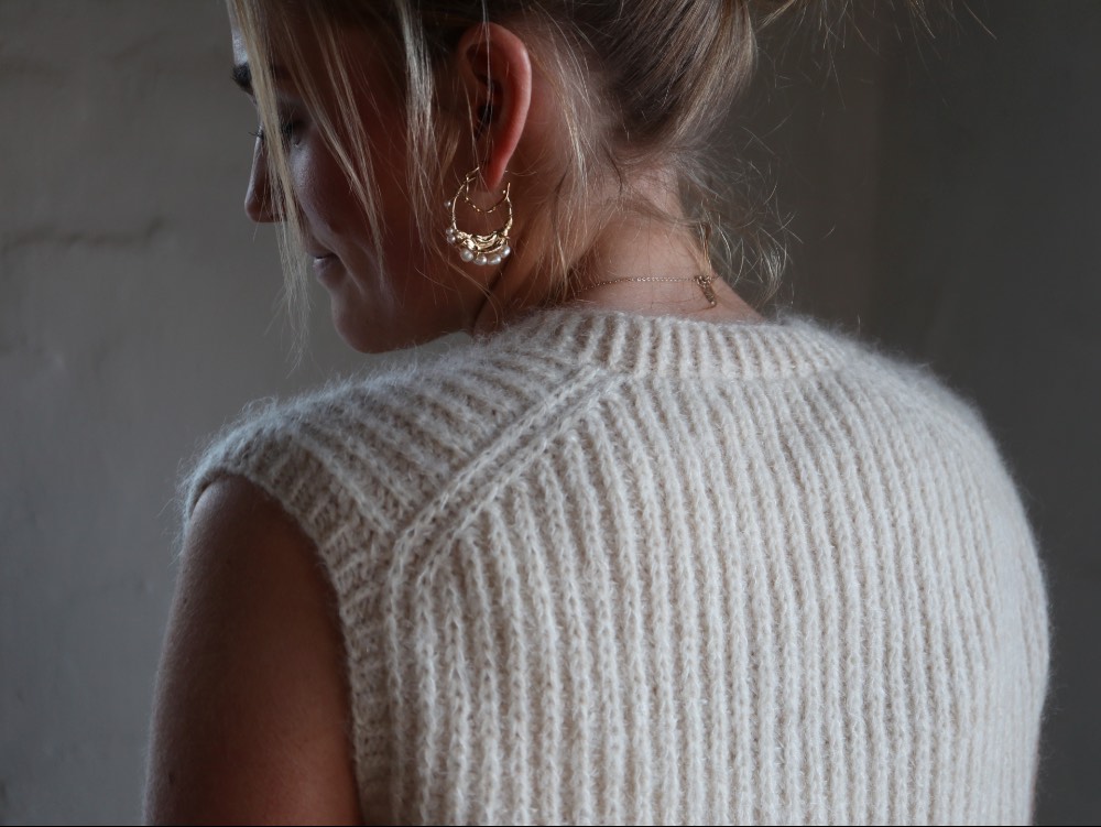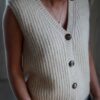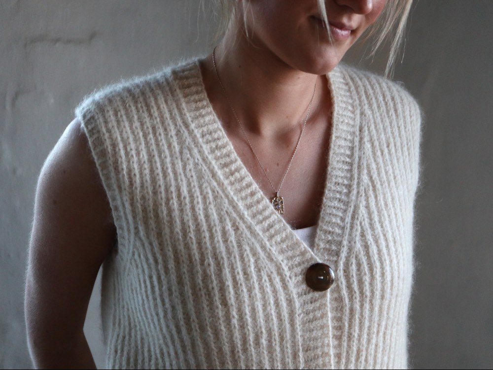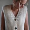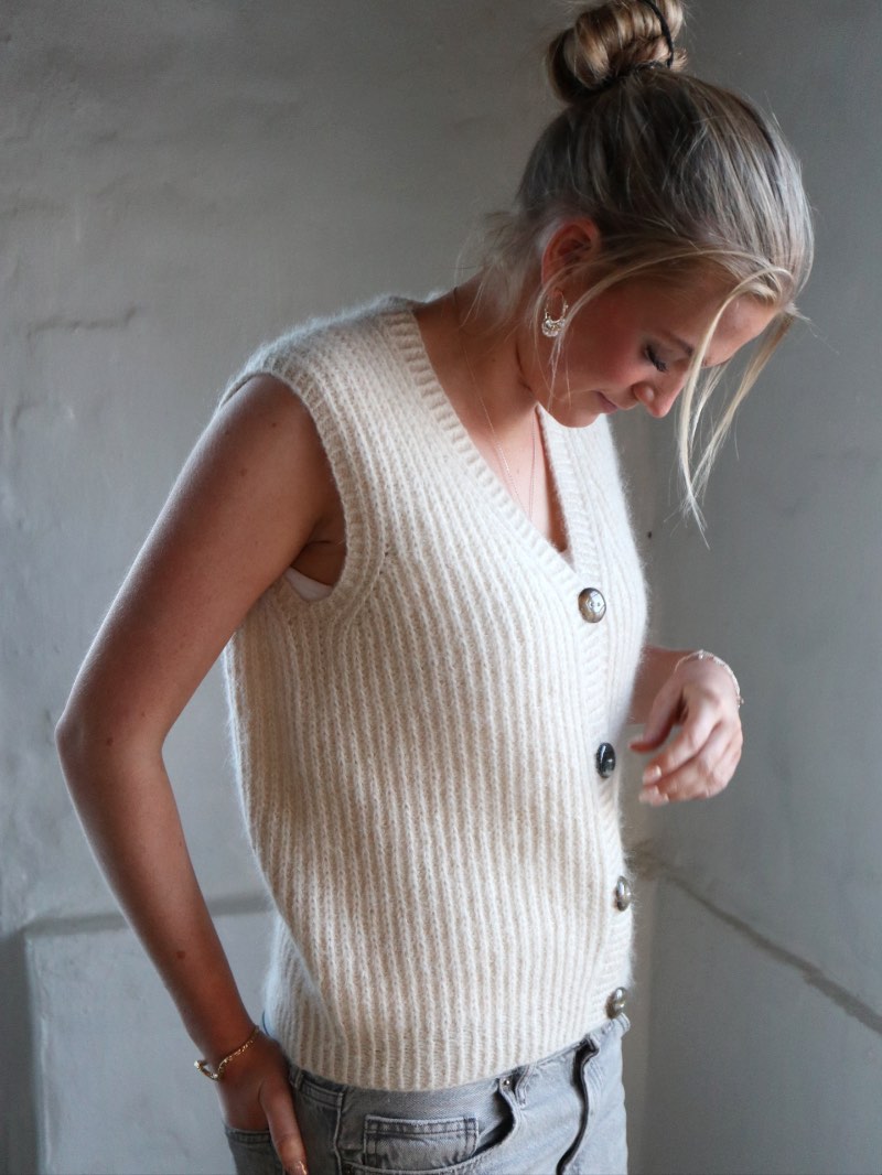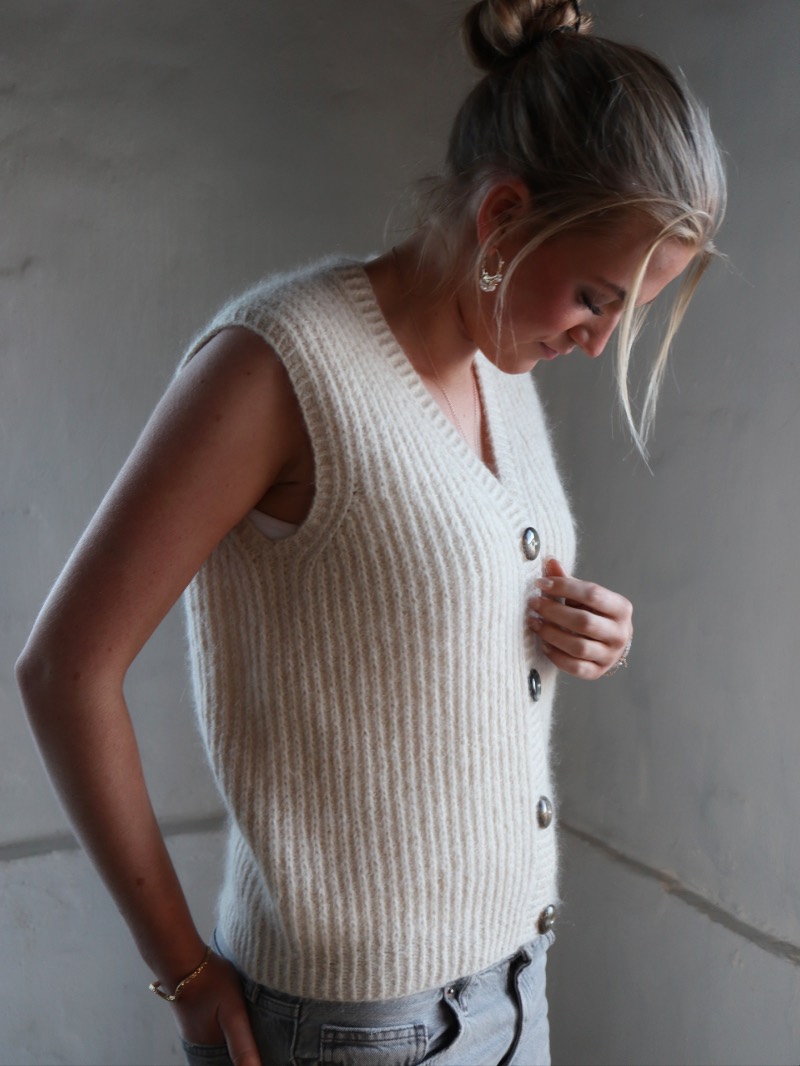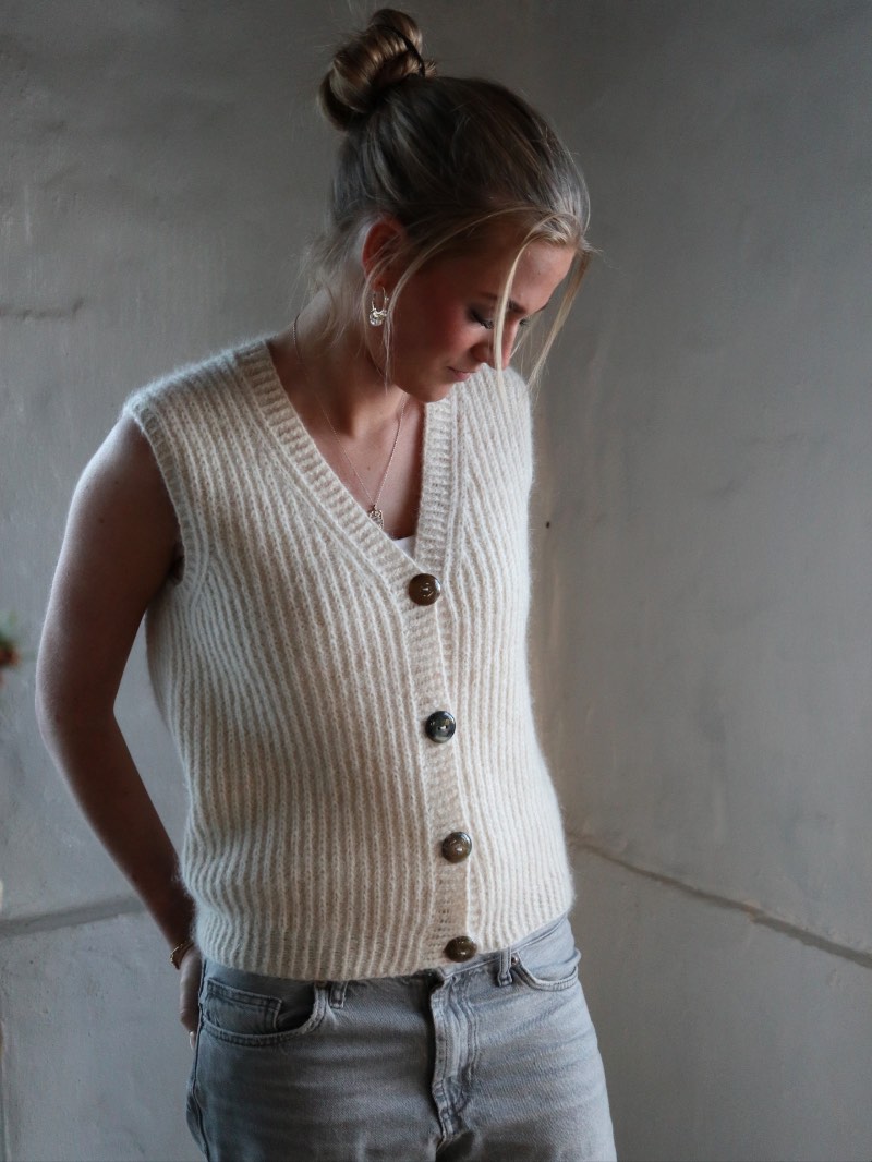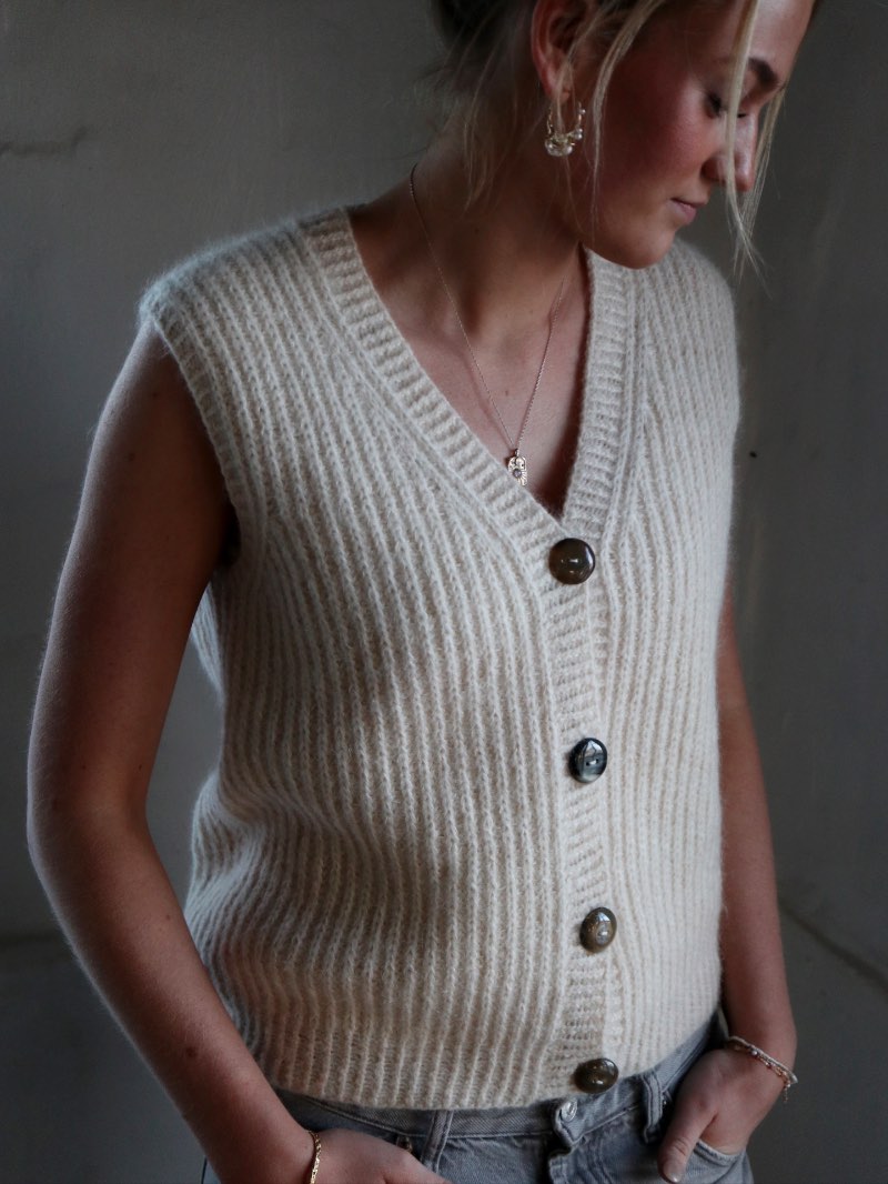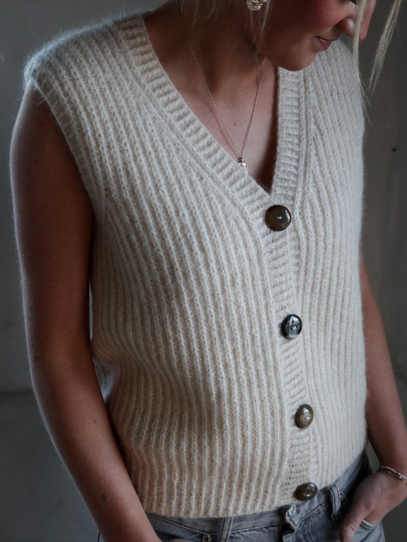 Robin Vest er en feminin og tidløs strikkevest designet af Knit Amore, skabt i halvpatent med klassisk V-udskæring og fine, gennemarbejdede detaljer. Den kan bæres åben eller lukket over skjorte, T-shirt eller kjole og giver både blødhed og struktur til garderoben året rundt.