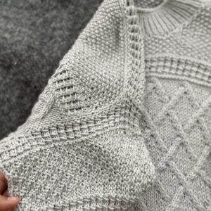 Øverst på både for- og bagsiden strikkes sweateren i perlestrik, mens et elegant hulmønster med omslag forbinder de forskellige sektioner. Midterstykket har klassiske snoninger, og det nederste af sweateren strikkes i dobbelt perlestrik. Kanterne afsluttes med enkelt rib og dobbeltstrik, og den italienske aflukning giver et smukt, professionelt udtryk.