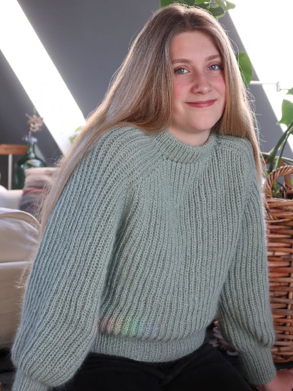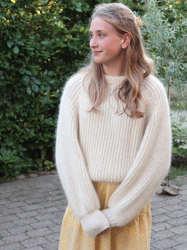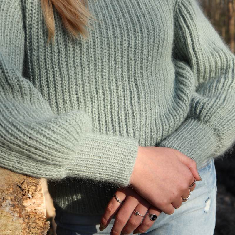 Savannah Sweater by Knitamore is a soft and feminine sweater. The sweater has balloon sleeves and a voluminous body with wide rib patterned edges, which gives it a soft and cozy look.