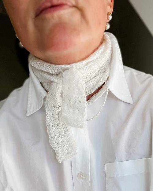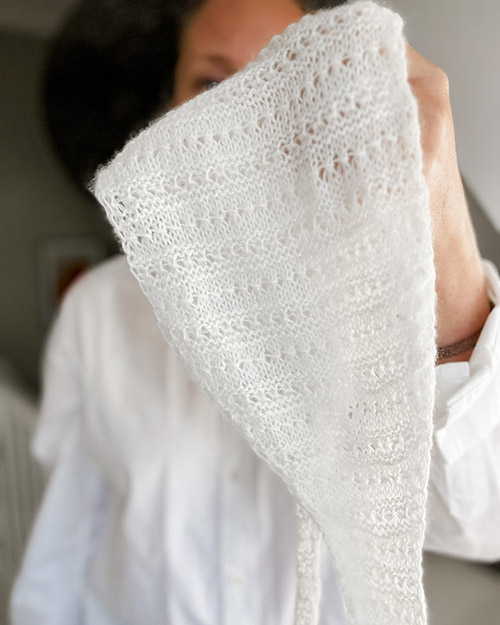 Tørklædet strikkes på pind 3,5 mm i fingering-garn, en betegnelse for et meget tyndt garn, der typisk har en løbelængde omkring 350–400 meter pr. 100 gram. Fingering-tykkelse giver et let, luftigt og smidigt resultat med fin struktur og god drapering. Strikkefastheden er 28 masker / 32 pinde i retriller efter vask og blok. Mønsteret gentager sig i sekvenser over fem pinde, hvilket giver et jævnt og vendbart udtryk på begge sider.