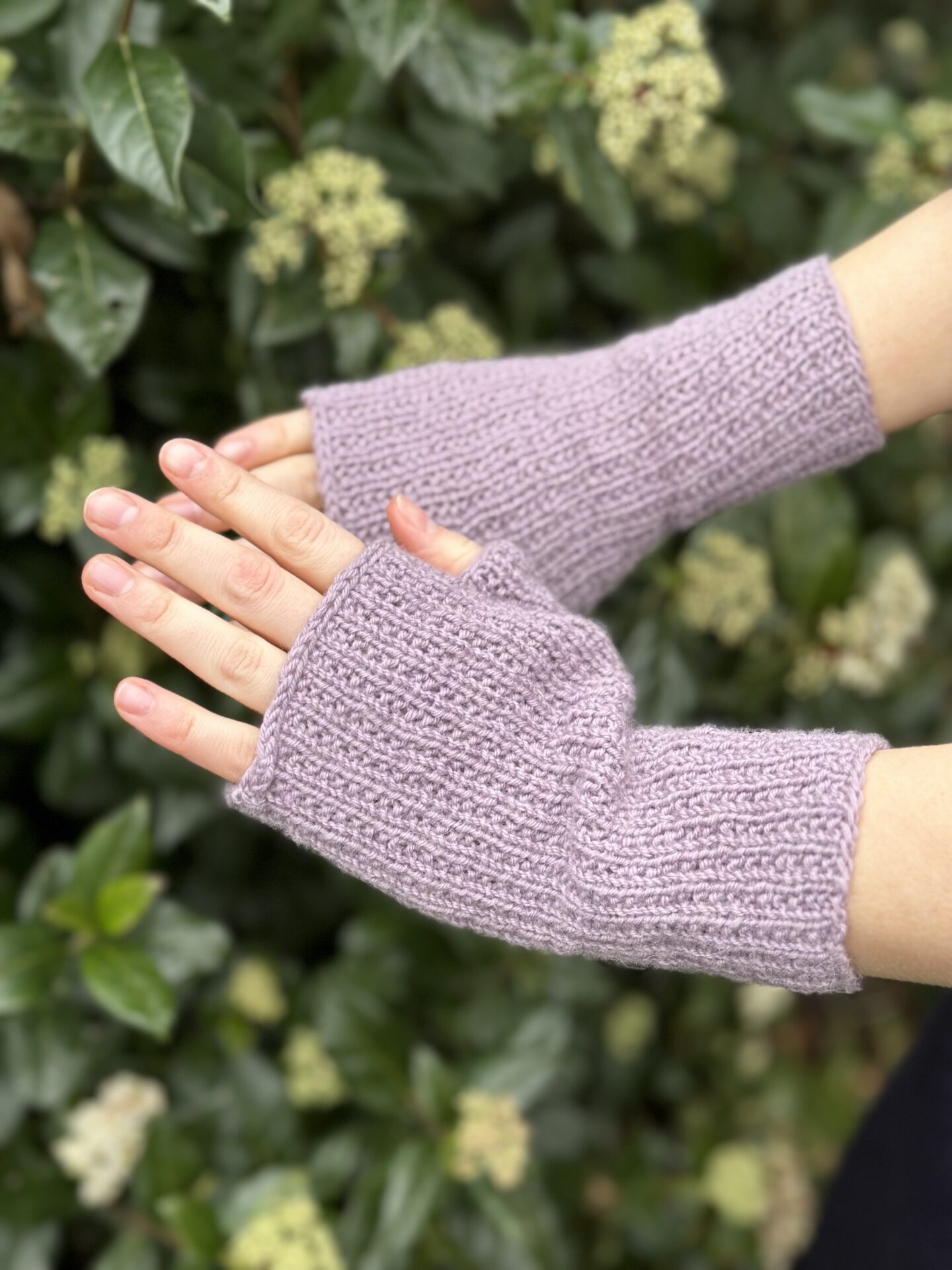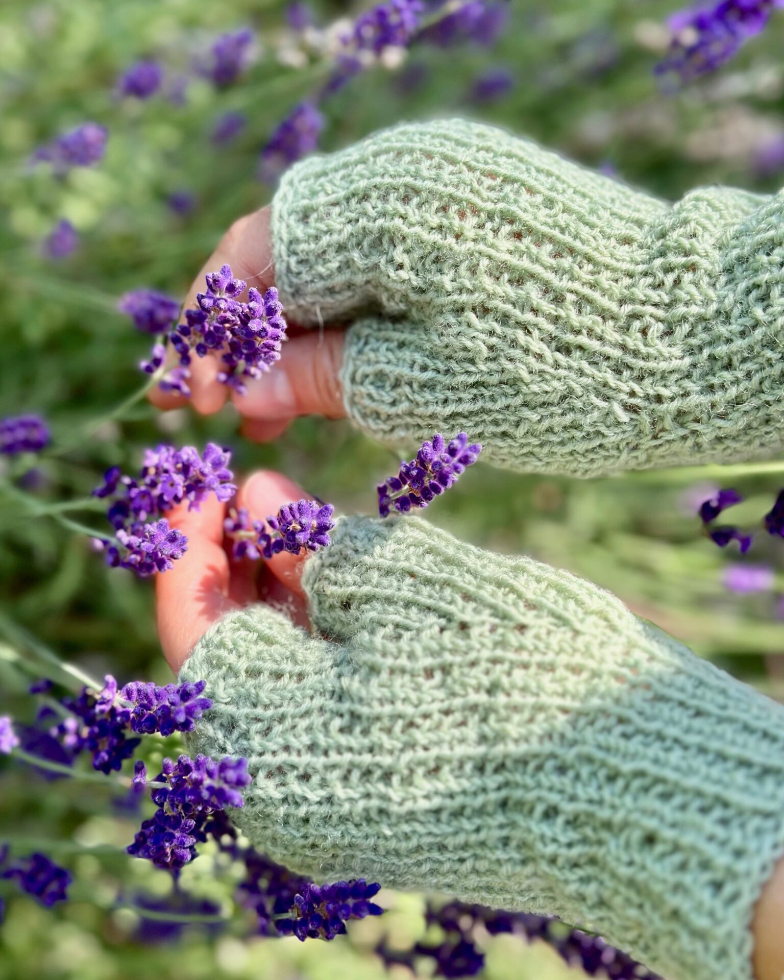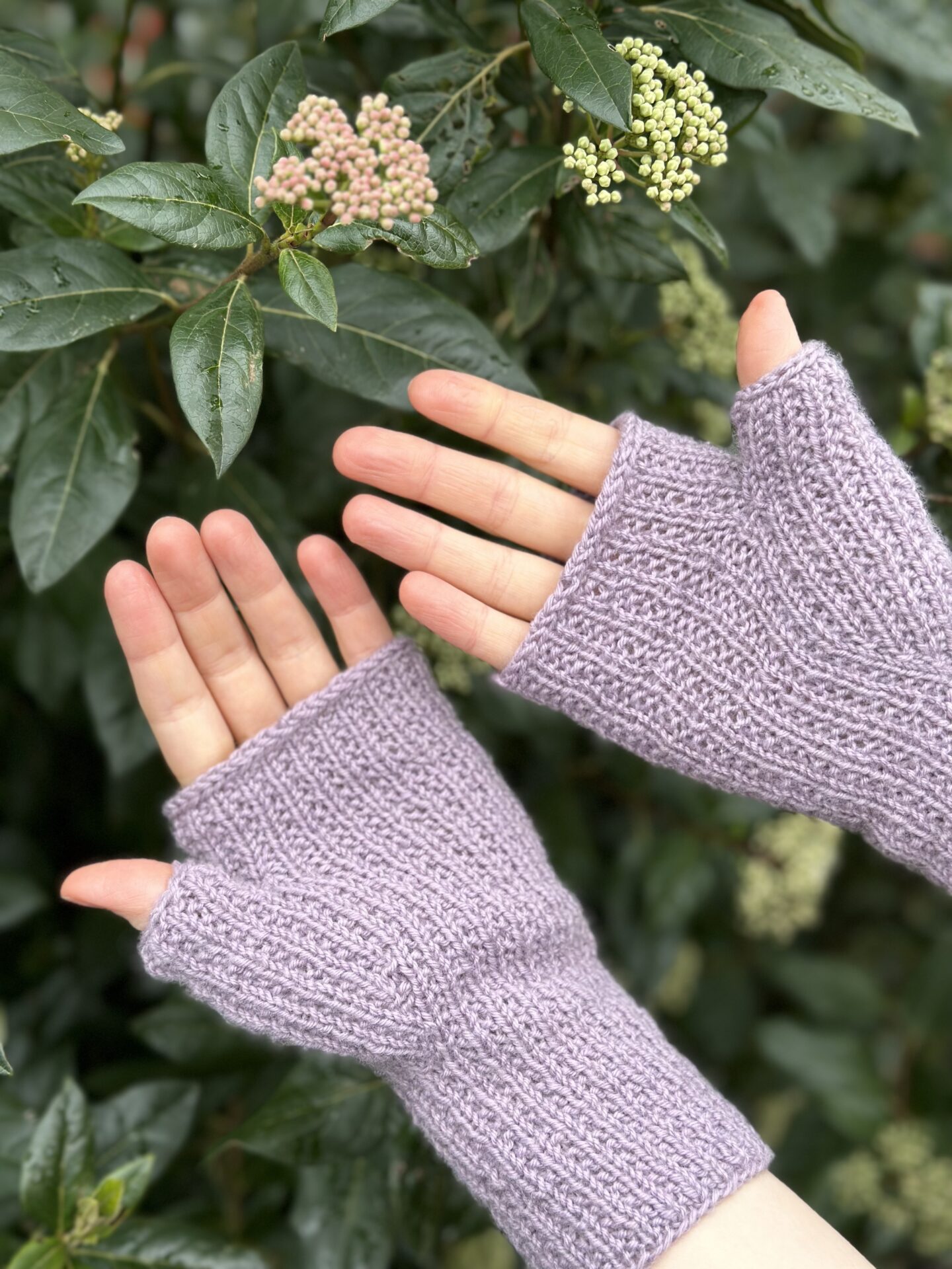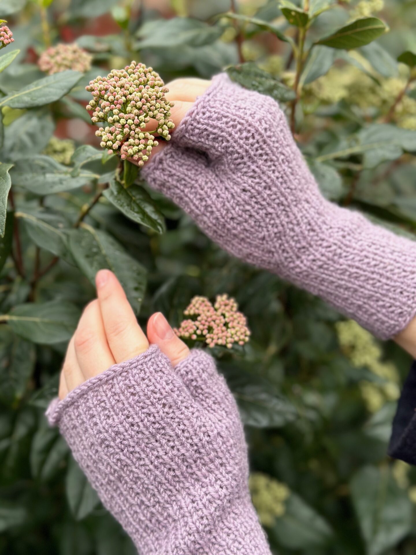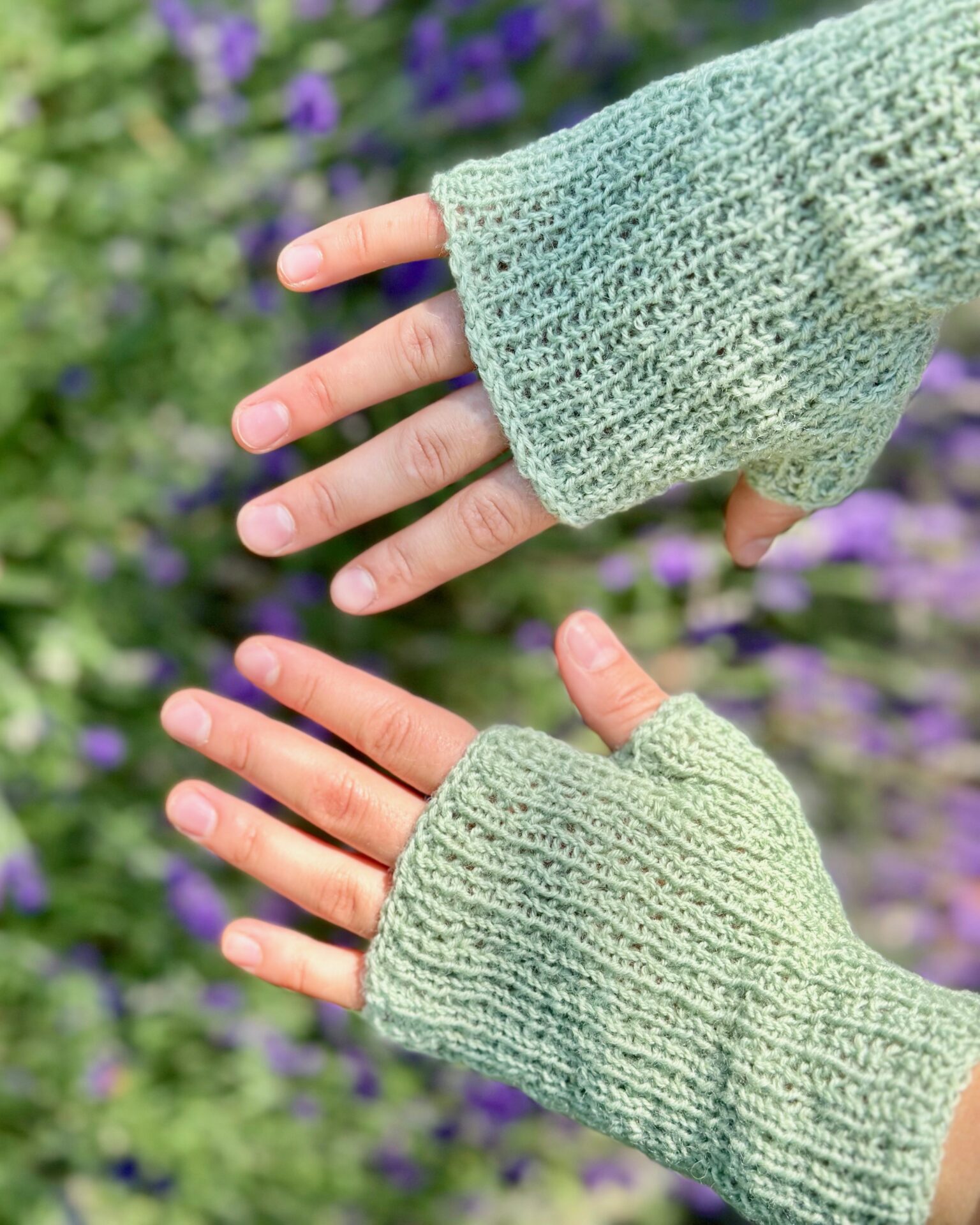 Seed Gloves är nybörjarvänliga fingerlösa vantar med pärlstickning. Vantarna är stickade av sockgarn och håller händerna varma både inomhus och utomhus.