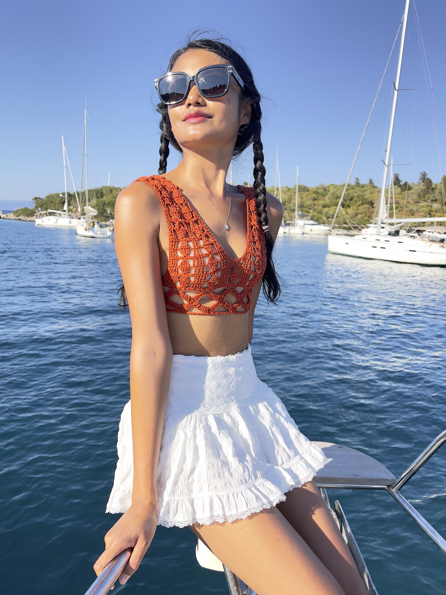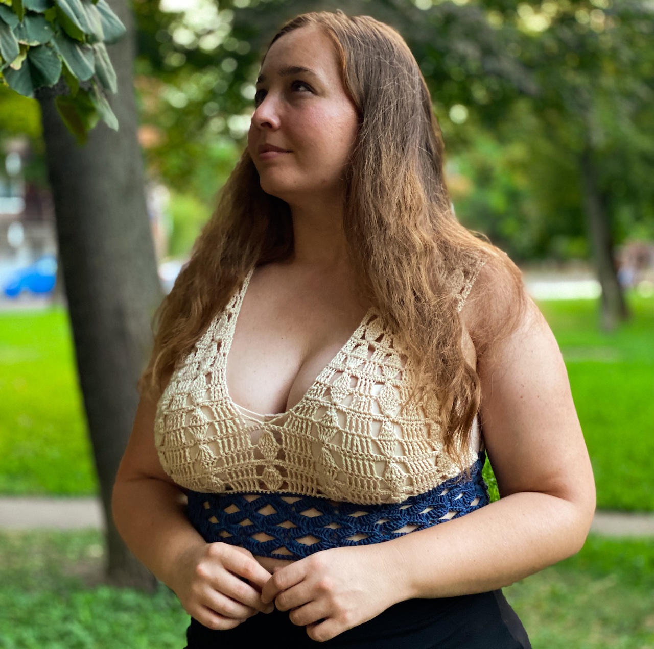 Introducing the Sierra Top, a lightweight and fashionable crochet crop top perfect for warm summer days and breezy beach nights. This stylish piece combines modern aesthetics with intricate diamond lace stitch patterns, making it a standout in any handmade wardrobe.