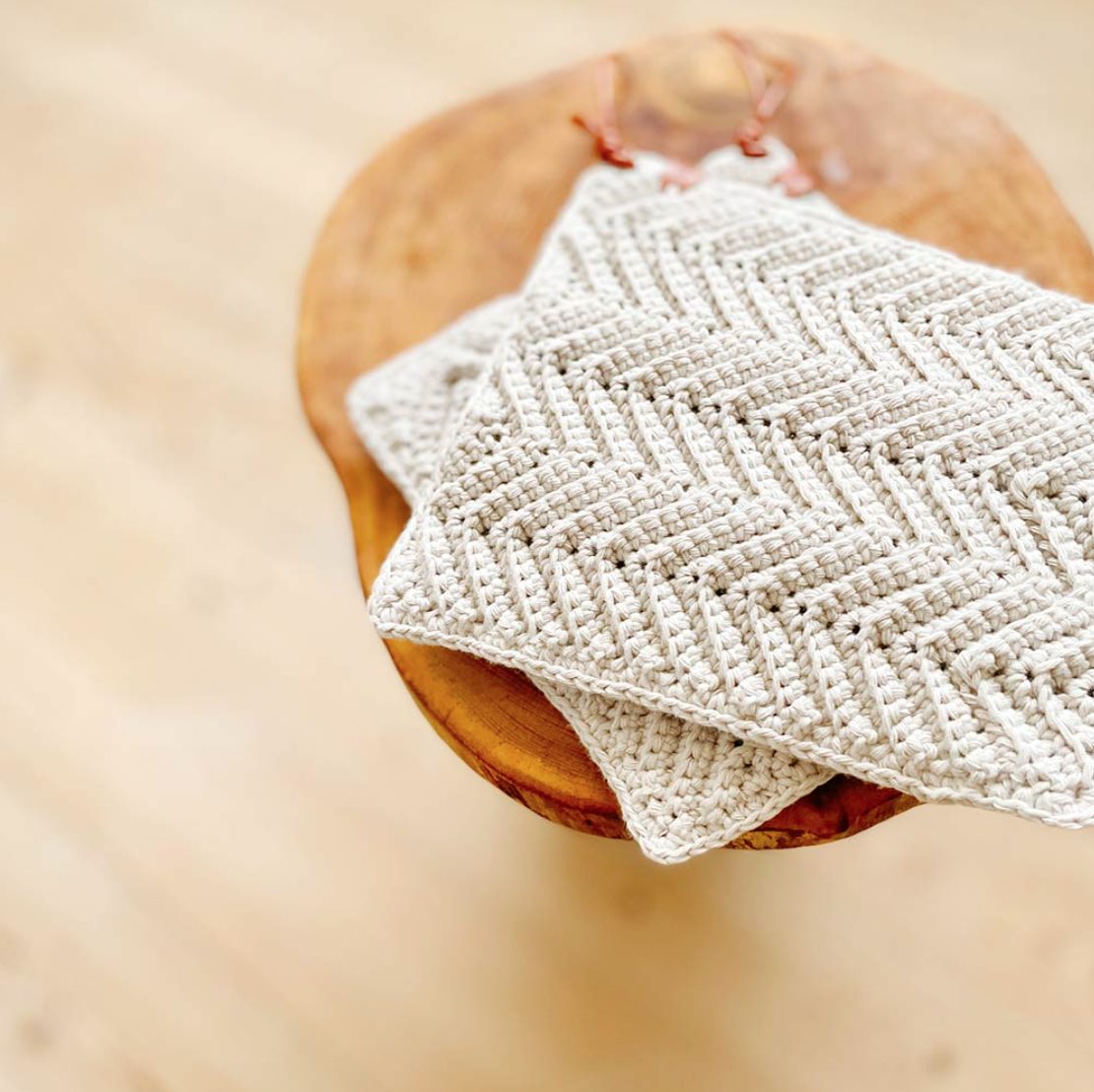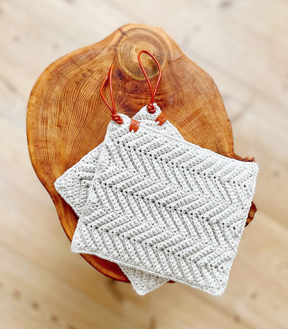 Disse tykke og tætte grydelapper er hæklet i et sildebensmønster som gør, at de er til at stole på når de hjælper varme sager ud af ovnen.