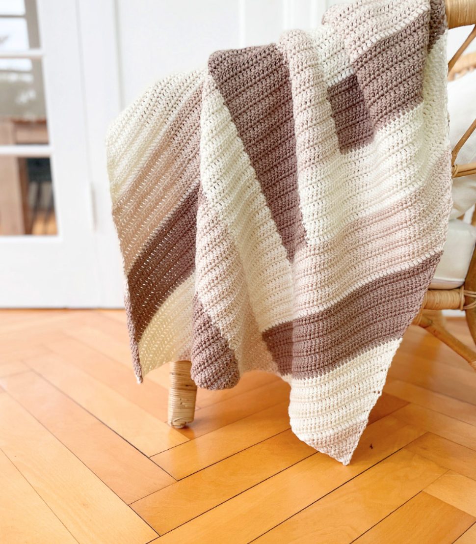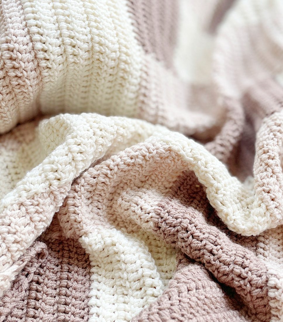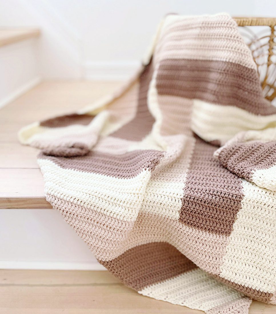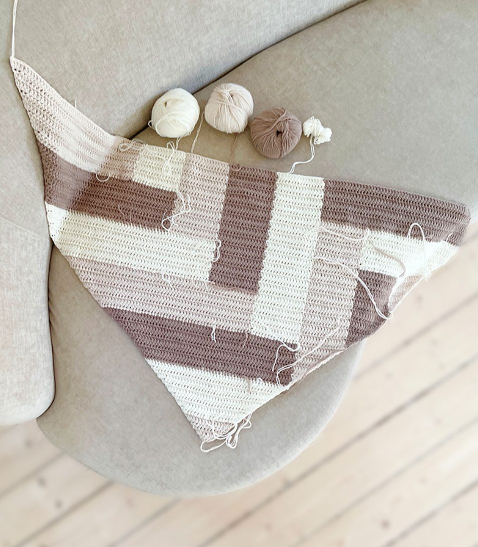 Med forskellige paneler, danner disse et flot sildebensmønster som udgør hele tæppet. Det er hæklet i et stykke, så der kun skal hæftes ender når projektet er færdigt.