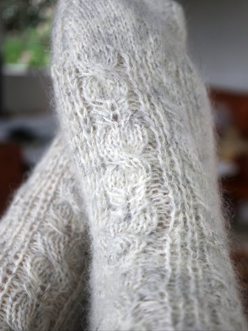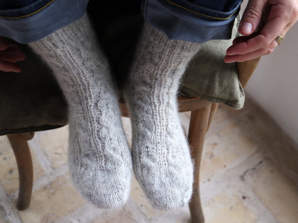 The socks are knitted from the cuff down with an Italian cast-on for an elastic start, followed by ribbing that flows into the striking combination of slip stitches and cables. The heel is shaped using short rows, ensuring a snug and comfortable fit. The foot continues in a mix of stockinette and pattern, and the toe is completed with decreases and grafted with the Kitchener stitch for a neat finish.