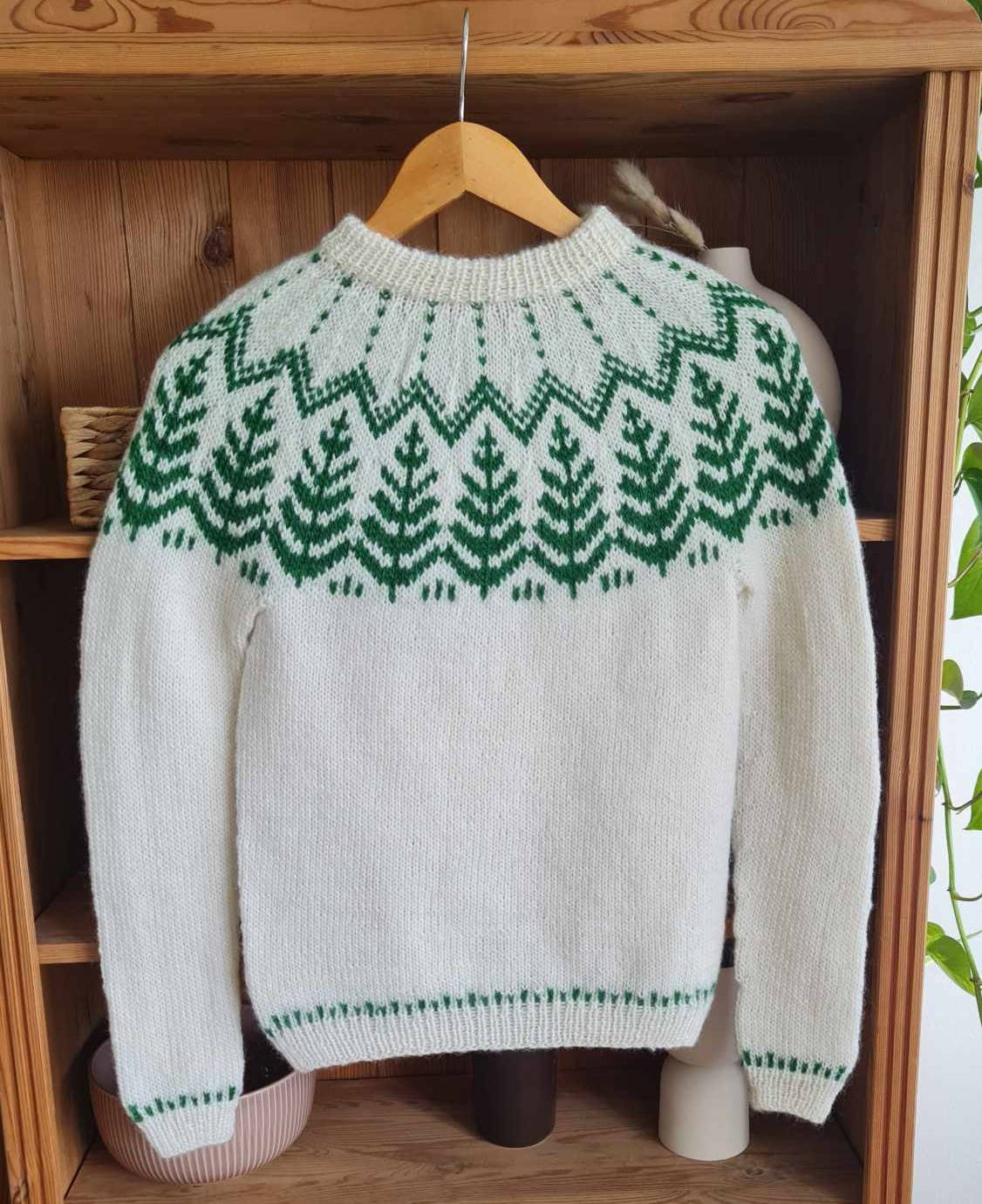 Sitkagreni Sweater er et klassisk islandsk design af Knitter from Iceland, inspireret af naturens farver og mønstre. Sweateren er en lopapeysa med et smukt bærestykke i flerfarvet mønster, der giver et autentisk og tidløst udtryk. Modellen strikkes nedefra og op, hvor både krop og ærmer strikkes rundt hver for sig og senere samles til bærestykket. Halsen afsluttes med en høj ribkant, der foldes dobbelt for et elegant og behageligt resultat.