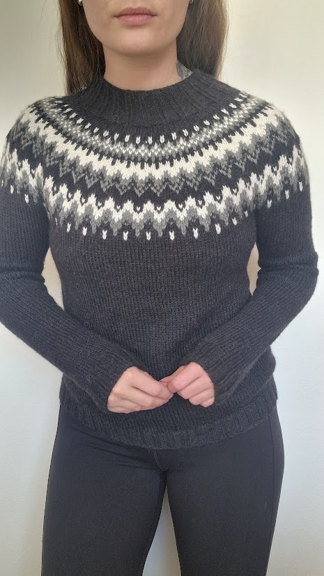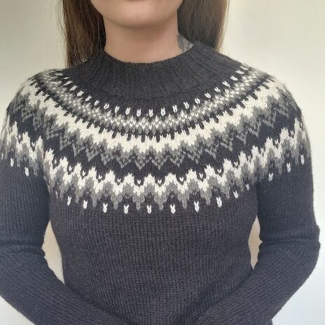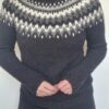 The pattern is worked in Ístex Léttlopi, a traditional Icelandic wool yarn (100 m per 50 g skein), though the designer also mentions Icewear Alpaca wool as an alternative. Léttlopi gives warmth, durability, and the rustic charm that makes Icelandic sweaters so unique. Yarn requirements vary depending on size, ranging from XXS to 5XL: