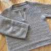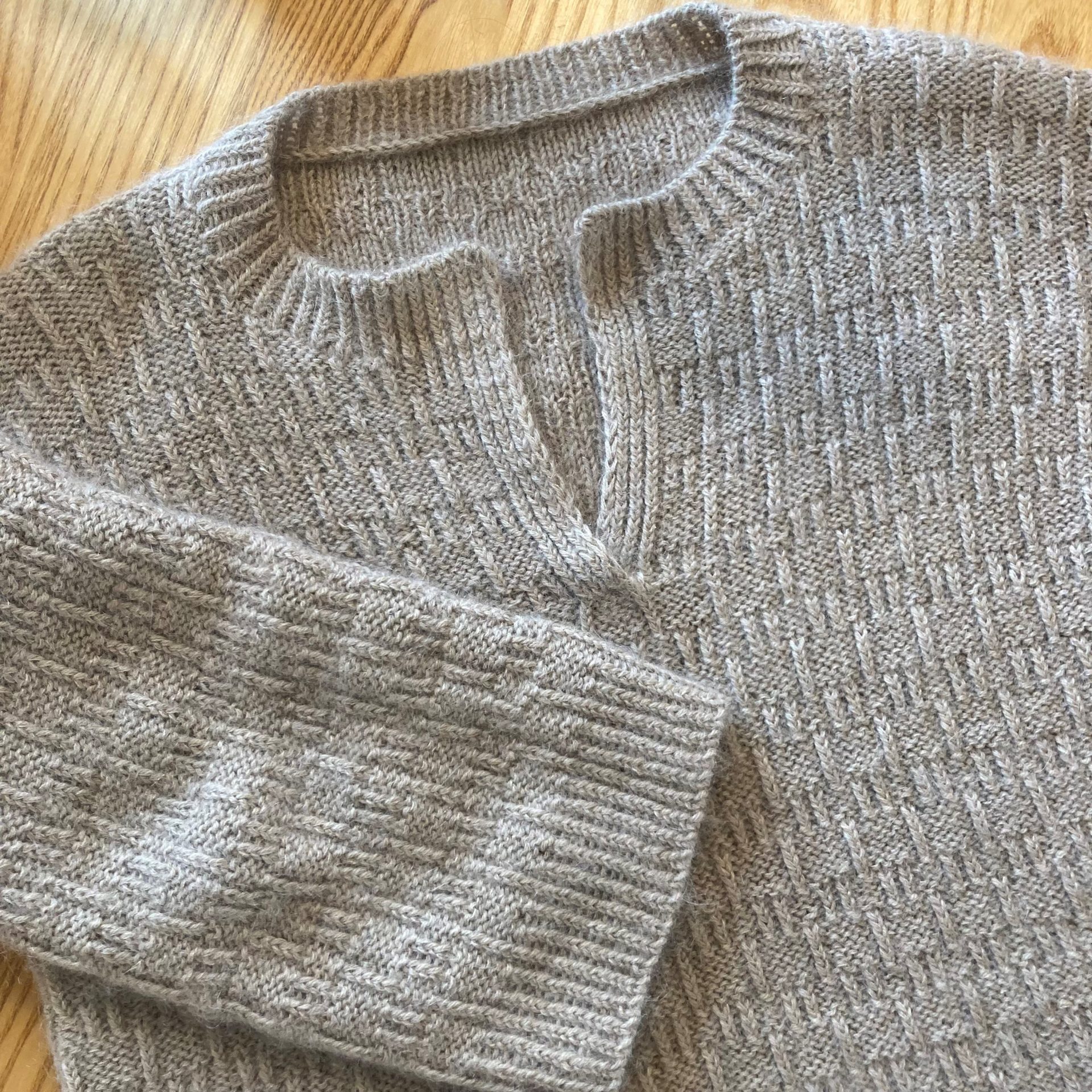 Når arbejdet når ærmegabet, deles det op og strikkes frem og tilbage for at danne skuldre og halsudskæring. Sweaterens V-udskæring fremhæves af en flot ribkant, der formes ved at slå masker op og strikke med indtagninger. Halsudskæringen og ribkanterne ved ærmer og krop afsluttes med en italiensk aflukning, som giver en professionel og elastisk kant.