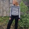 This pattern is worked in the well-known Icelandic yarn Ístex Léttlopi, which comes in 50 g skeins with a yardage of 100 m per skein. That equals 100 m per 50 g, or 200 m per 100 g. Léttlopi is spun from 100% Icelandic wool, making the sweater lightweight, warm, and breathable. The yarn is used in three colours: Light Grey (0056) as main colour, combined with Black (0059) and White (0051) for the striking yoke. Depending on size, the yarn requirements vary: