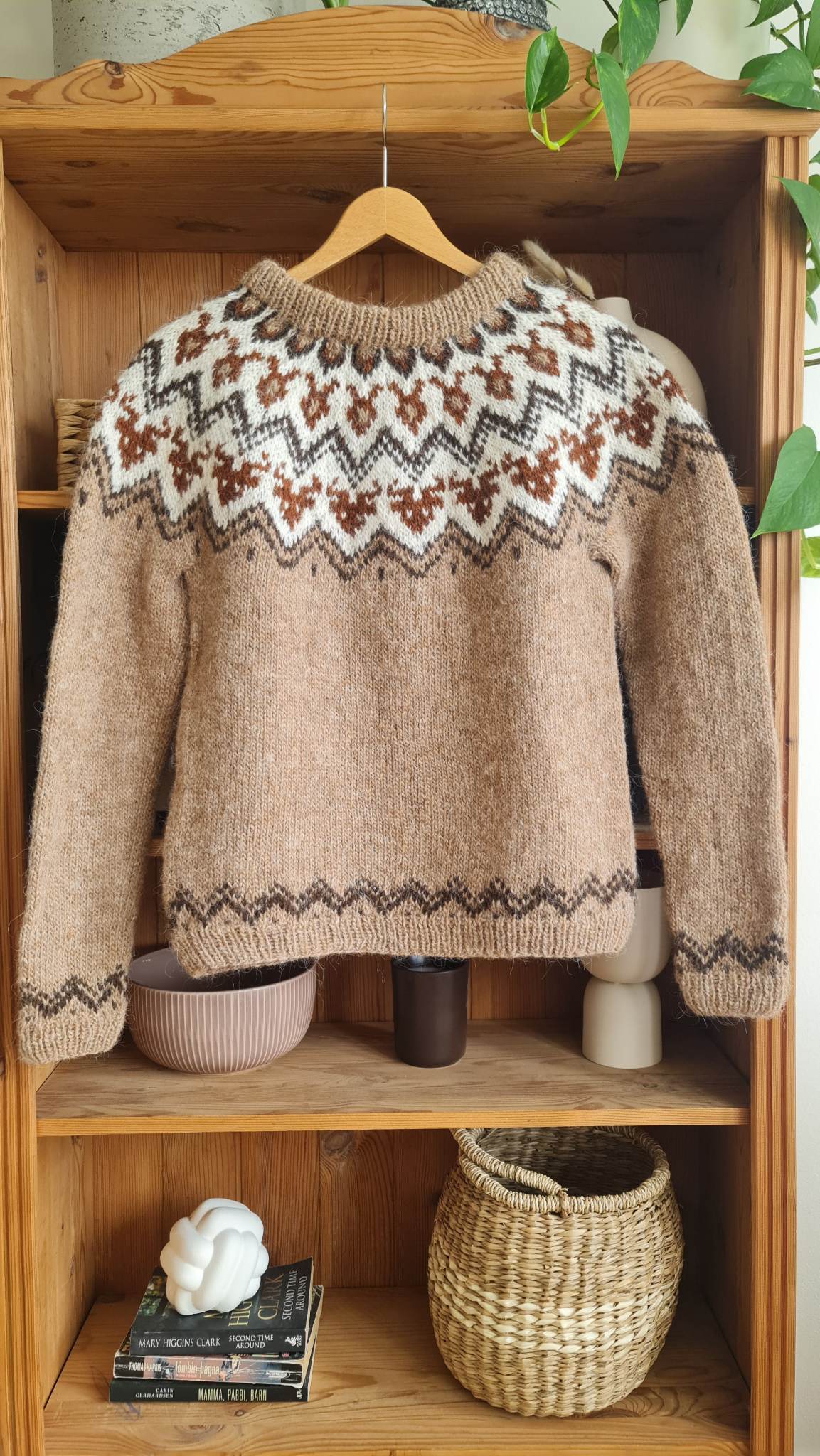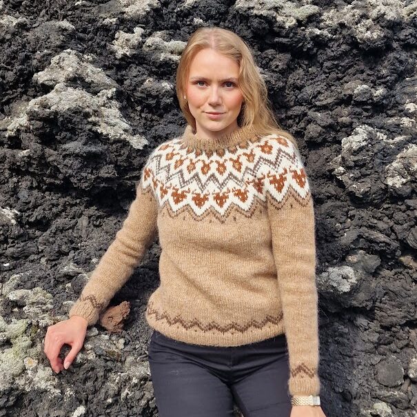 The pattern is knitted using Ístex Léttlopi, a classic Icelandic wool yarn spun from 100% Icelandic wool. Each skein weighs 50 g and has a running length of 100 m, which equals 100 m per 50 g. The yarn is warm, lightweight and perfect for creating durable garments with breathability and water resistance. For this sweater you will need four colors: Barley 1419 as main color, combined with White 0051, Dark Brown 0867 and Rust 9427 for the contrasting yoke pattern. Depending on the size, the required skeins vary from 6 skeins of the main color in XXS up to 11 skeins in size 5XL, along with 1–3 skeins of each contrast color.