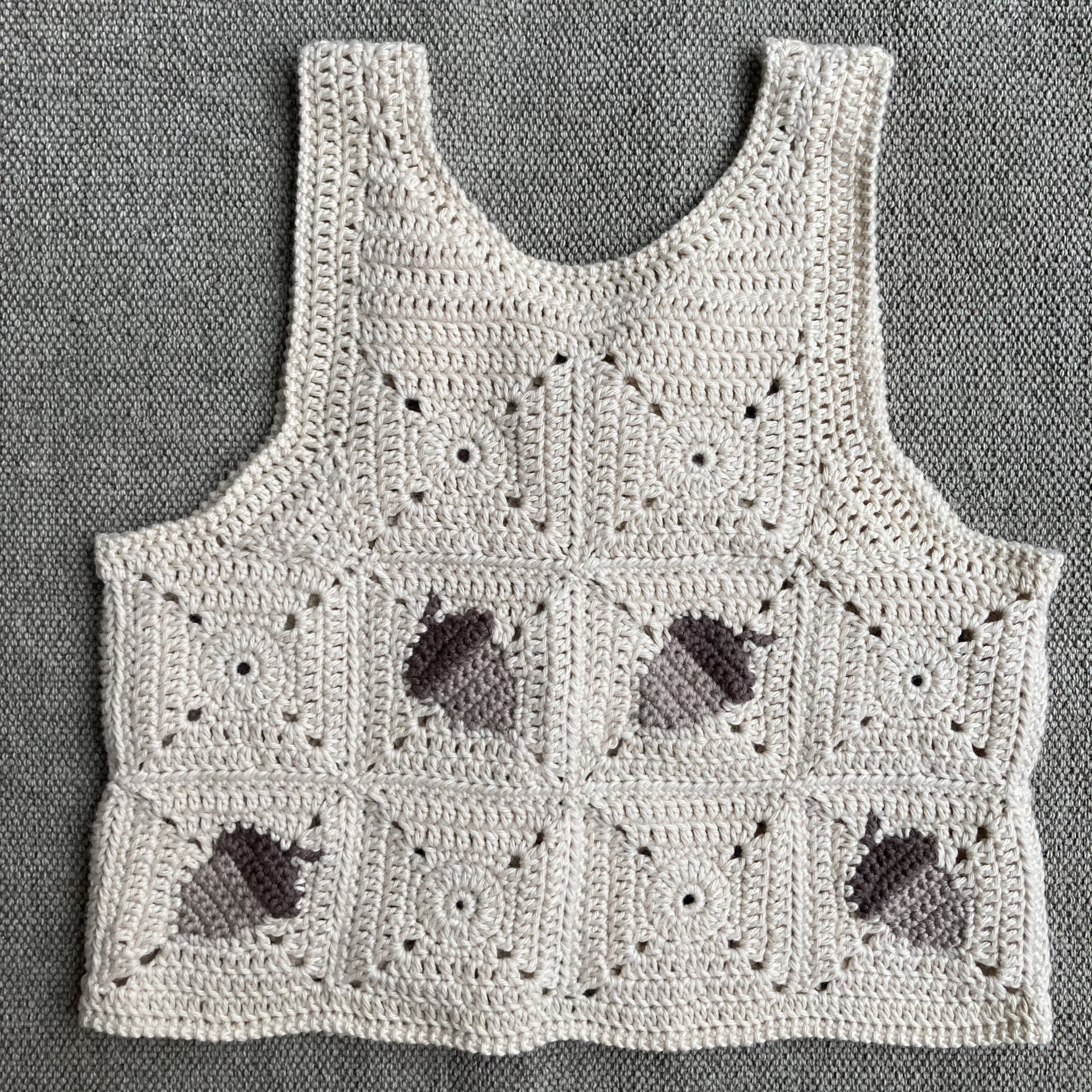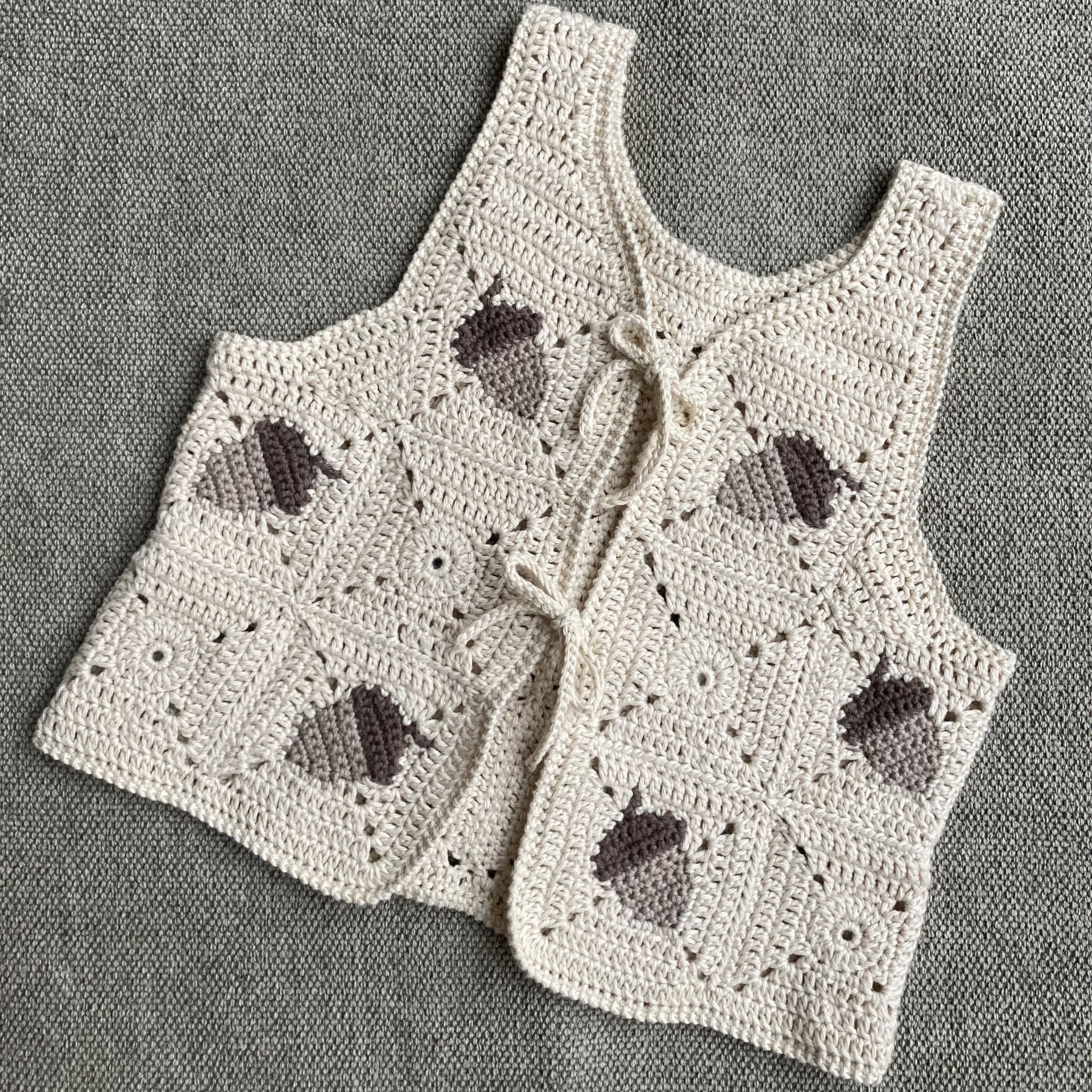 The Acorn Vest af Violi er en hæklet vest til de mindste med et charmerende agern motiv.