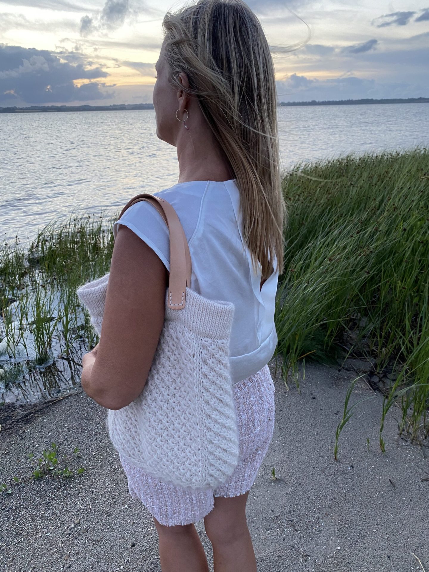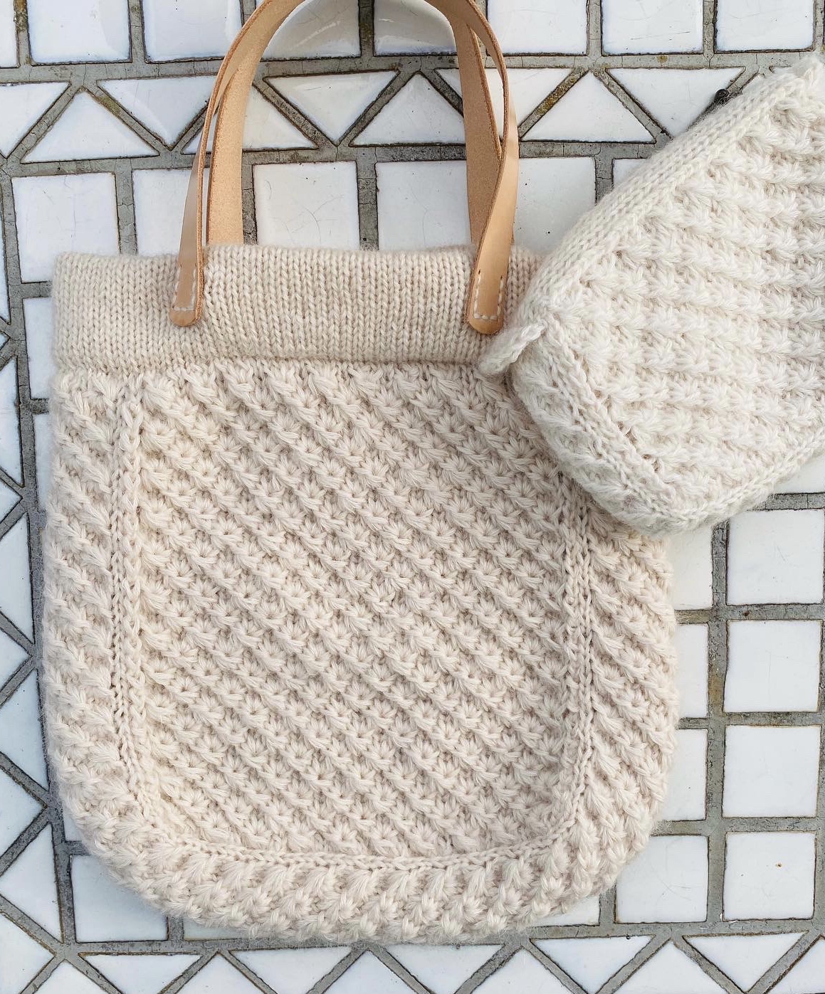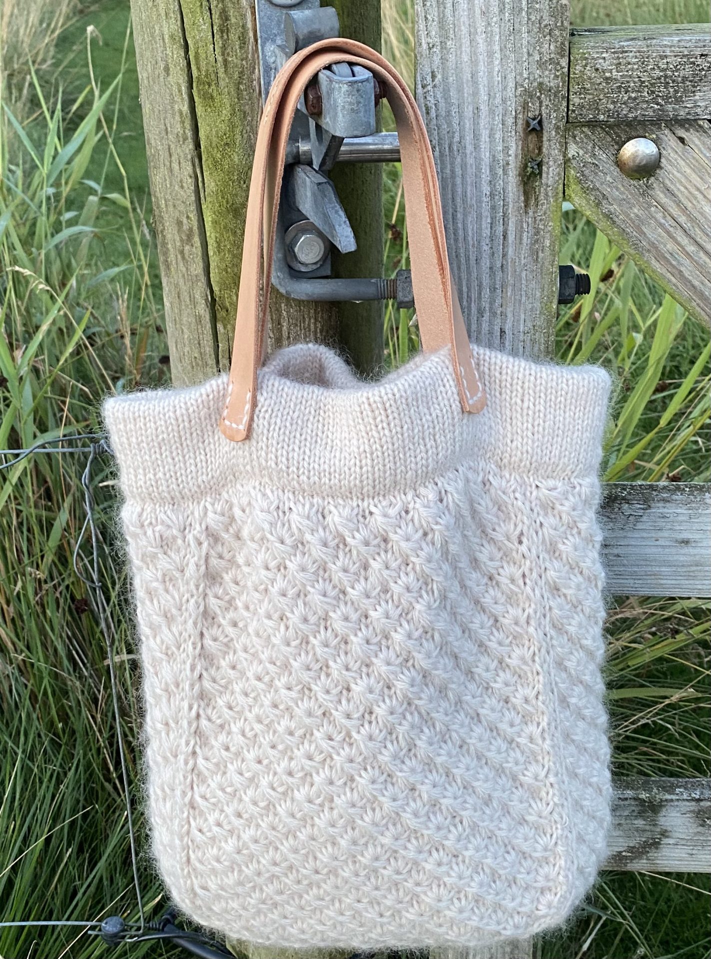 Taske med plads til lidt af det hele. Perfekt til at have med på farten. Den er strikket i Daisy Flower mønster, og tasken er med strikket foer indvendig.