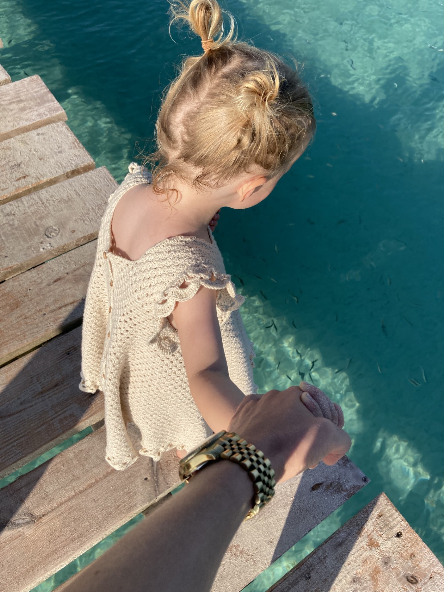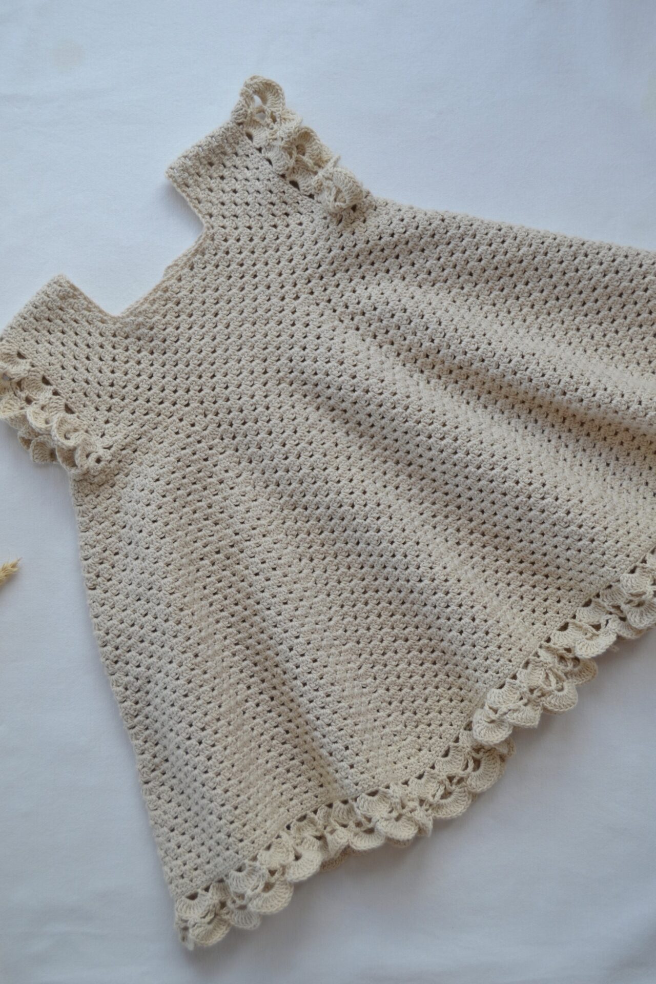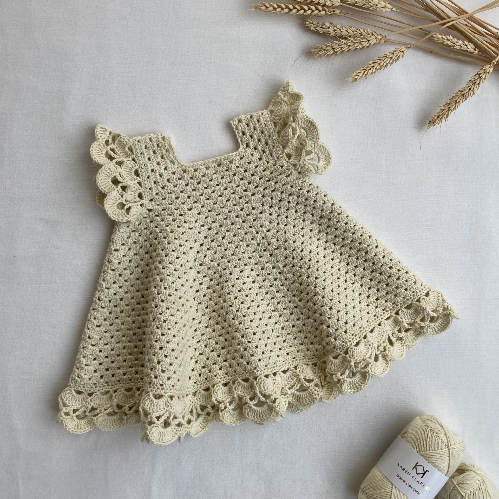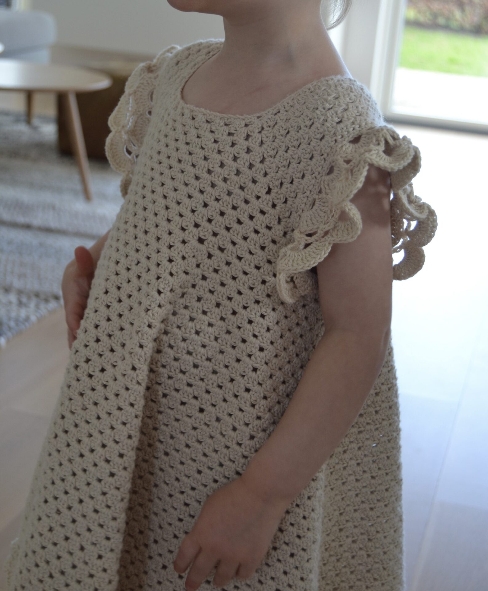 The Frill Dress no. 1 fra Violi er en yndig og feminin hæklet kjole til de mindste, designet med romantiske flæsedetaljer og et smukt fald. Kjolen hækles oppefra og ned, hvilket gør det nemt at justere længde og pasform undervejs. Den elegante struktur og lette silhuet skabes med stangmasker, dobbelt stangmasker og fine udtagninger, som tilsammen danner det karakteristiske mønster. En særlig finesse er de dekorative flæser på ærmer og nederste kant, som giver kjolen et eventyrligt udtryk.
